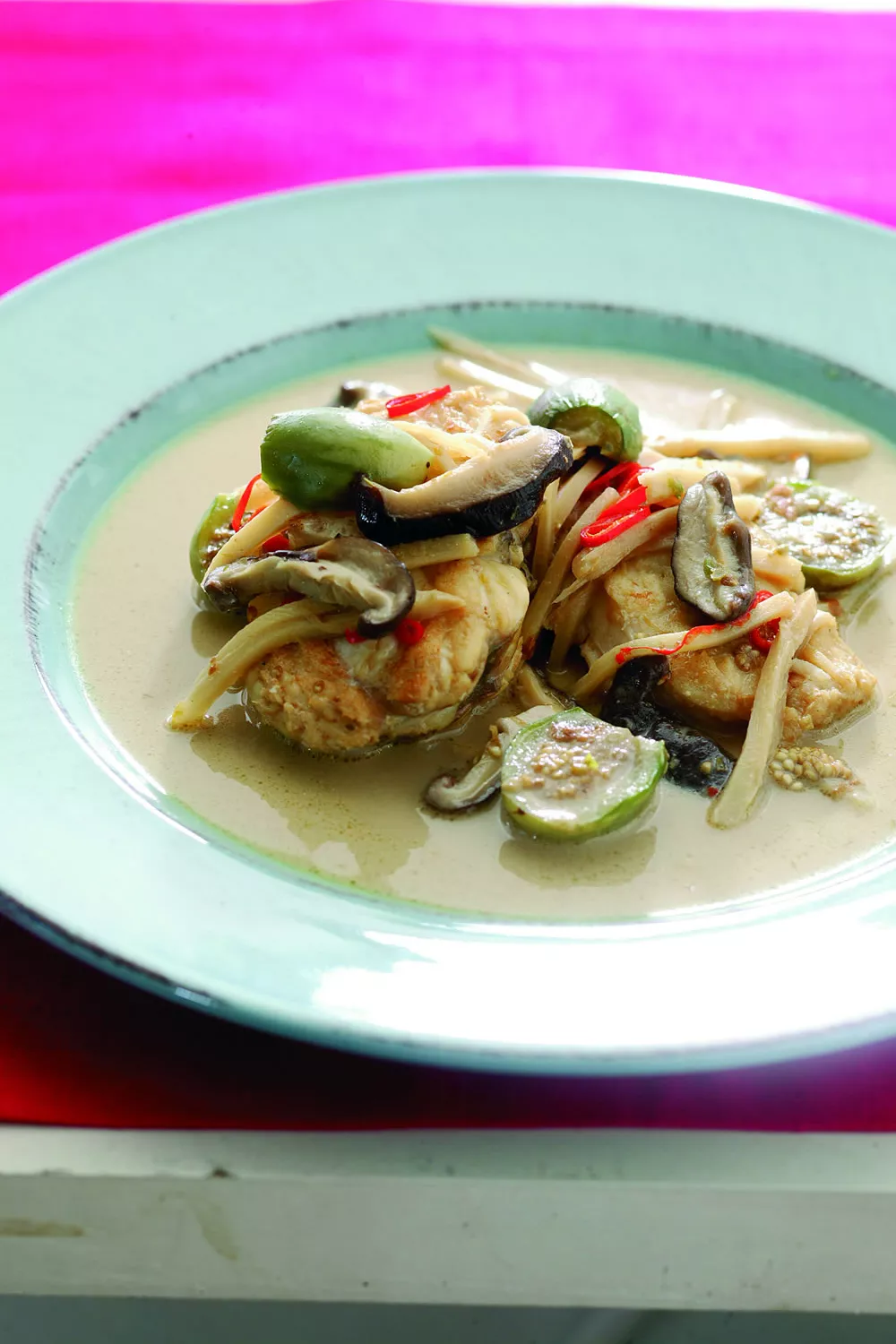 Romige Thaise visstoof met zeeduivel die eerst kort wordt aangebakken en daarna zacht stooft in kokosmelk, kippenbouillon, groene currypasta en een vleug sojasaus. Shiitake, mini aubergines, bamboescheuten en pimentpaprika geven bite en pit, ideaal als geurige curry voor een doordeweekse avond of een relaxed weekenddiner in herfst en winter. Serveer met mie of warm naanbrood.