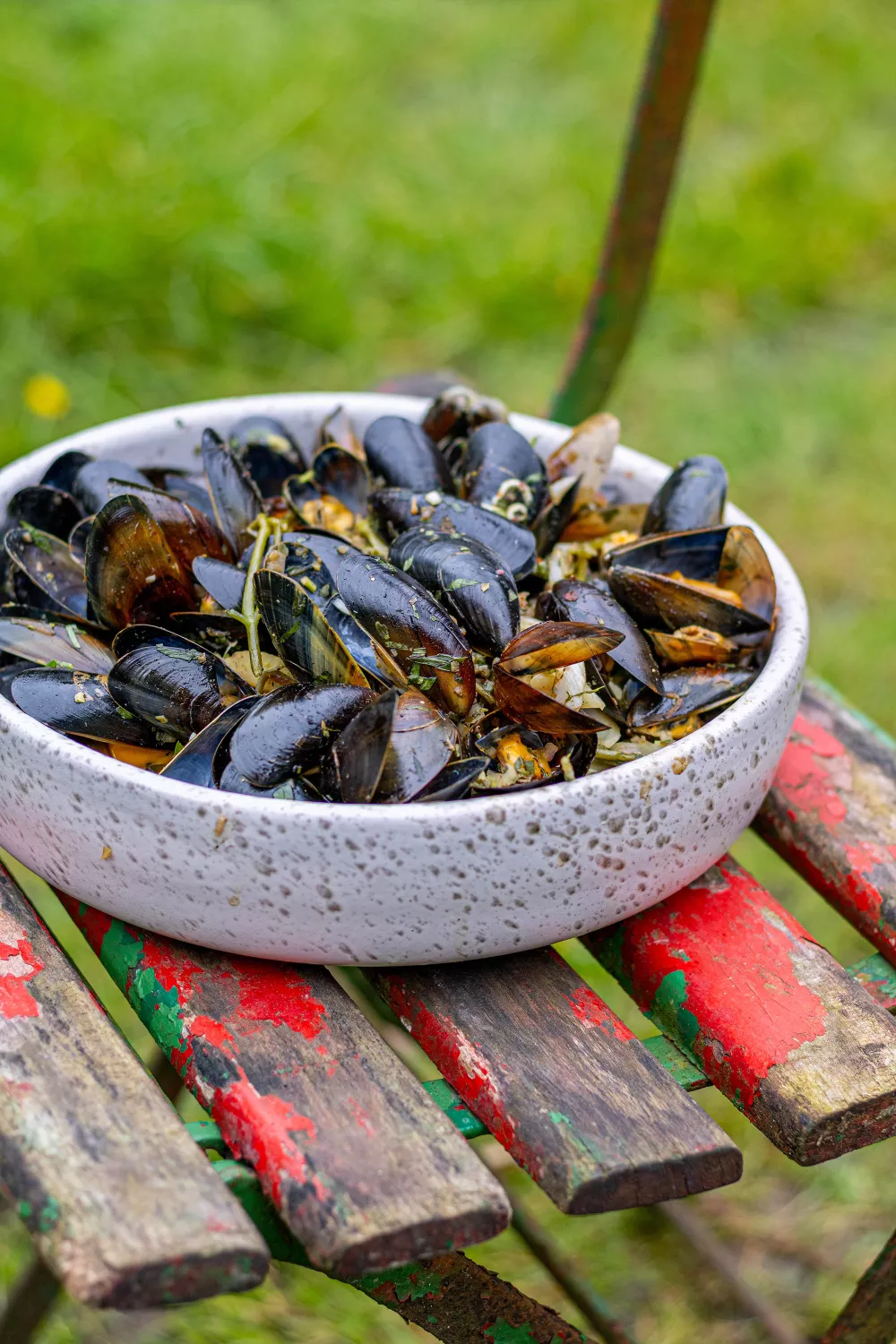 Malse mosselen krijgen een frisse twist met knapperige venkel, zilte zeekraal en een scherp xeres azijnsausje van sjalot, dragon en mosselkruiden. Op de hete plancha bak je de groenten kort en giet je het zuur erbij om de schelpen onder een deksel snel te stomen tot ze openstaan. Een licht en zomers visgerecht dat perfect is als borrelhap of hoofdgerecht bij een barbecue of avond aan zee.