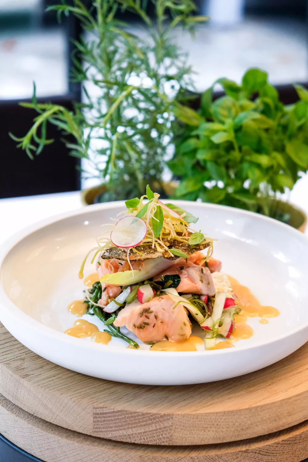 Gestoomde zalm met witloof, wakamé en radijsjes