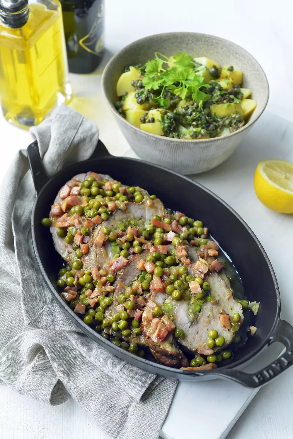 Dit gevulde kalfsgebraad met frisse aardappelsalade brengt sappig kalfsvlees gevuld met doperwtjes, Parmezaanse kaas en mozzarella samen tot een romig en hartig gerecht. De rollade wordt eerst dichtgeschroeid en daarna in de oven gegaard, terwijl een salsa verde met kappertjes, ansjovis en citroen de koude aardappelblokjes opfrist. Ideaal als feestelijk hoofdgerecht voor een zonnige lente- of zomerdag.