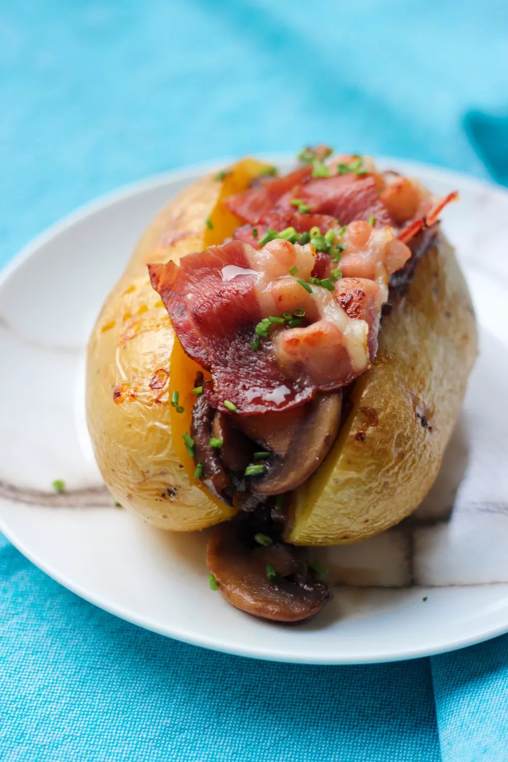 Vul de aardappels met de champignons en de sneetjes spek. Werk af met fijngehakte bieslook.