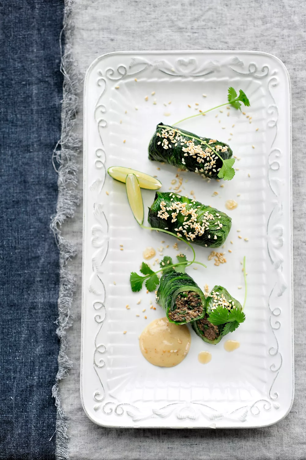Serveer de andijvierolletjes met de sesammayonaise en besprenkel ze met wat geroosterde sesamzaad en sesamolie. Serveer er enkele partjes limoen en wat takjes koriander bij.