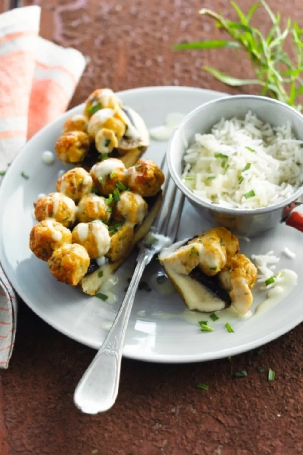 Zachte ovengebakken portobello's gevuld met gekruid kippengehakt, verse dragon en peterselie bieden een hartige mix van umami en frisse kruiden. Een romige saus van gevogeltebouillon, droge witte wijn en room wordt ingekookt tot een glanzende binding en maakt het gerecht feestelijk maar eenvoudig. Perfect als hoofdgerecht of smaakvol voorgerecht bij lente en herfst, geserveerd met rijst of knapperig brood.
