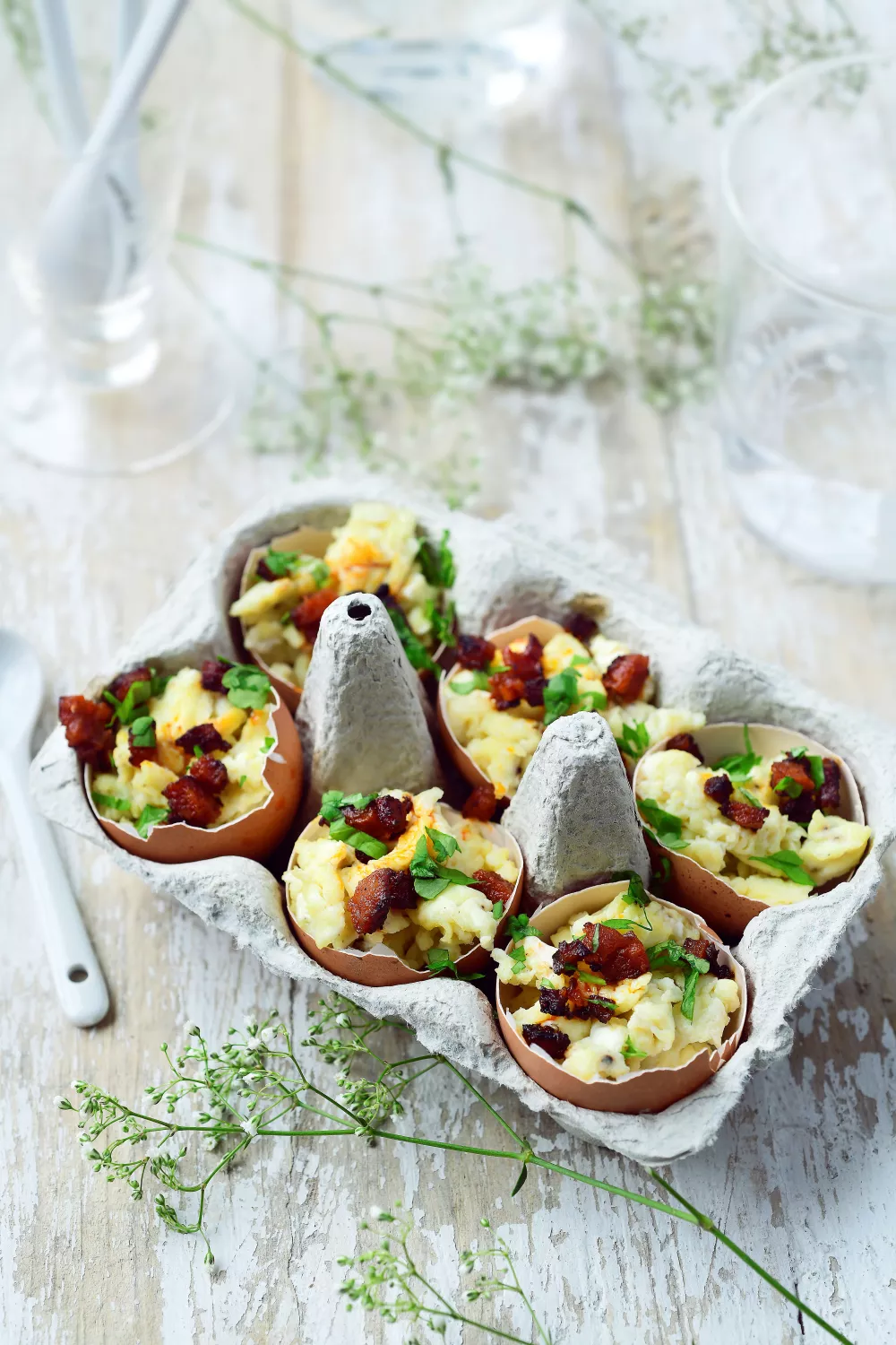 Verdeel het roerei over de eierschalen. Lepel er wat van de chorizocrumble over en werk af met wat bladpeterselie.