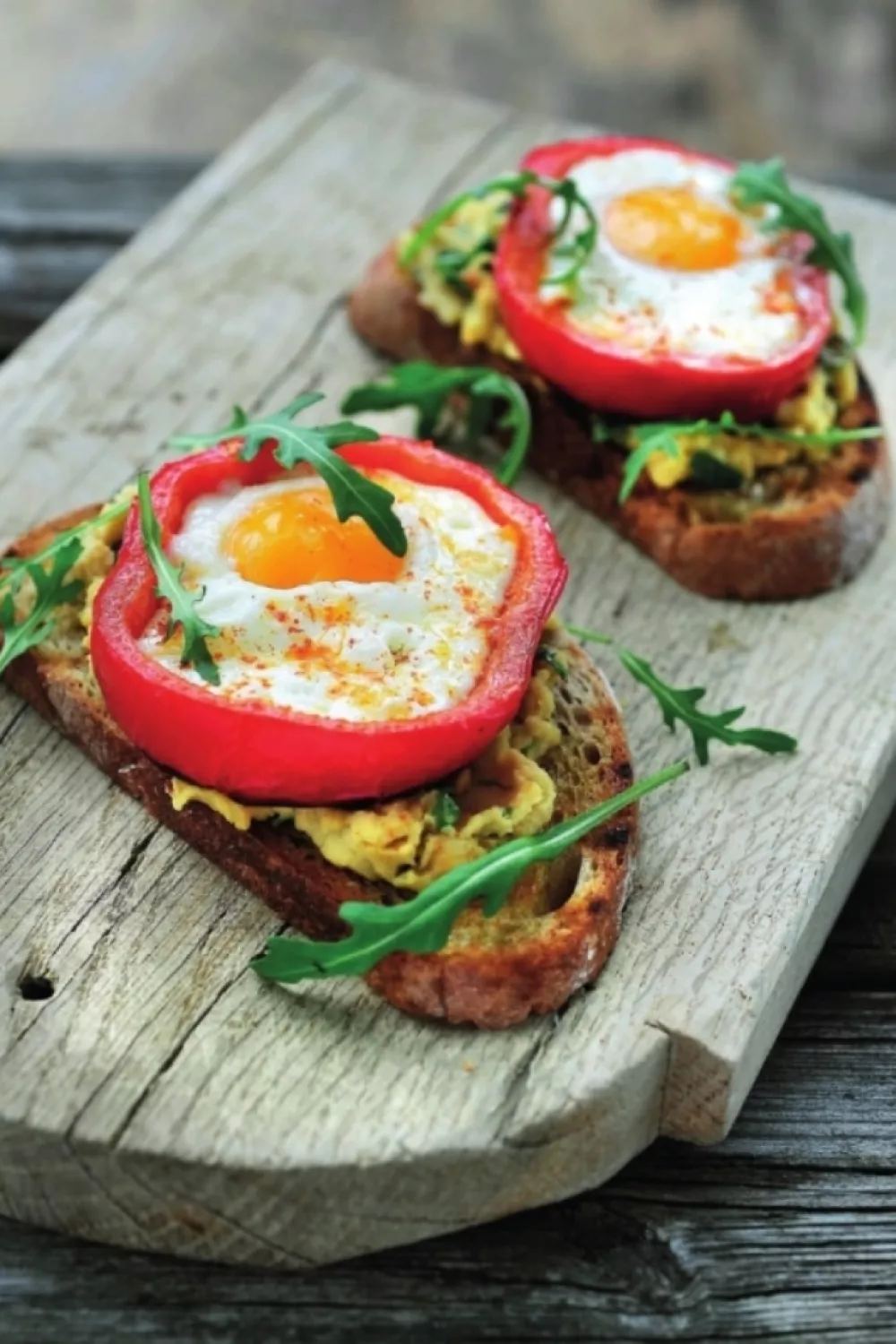 Gevulde geroosterde paprika's met ei en romige kikkererwten en tahin zijn een kleurrijk en voedzaam vegetarisch lunch of brunchgerecht vol Mediterrane en Midden Oosterse smaken. De paprika's worden in de oven geroosterd, de kikkererwten grof gepureerd met komijn, citroen en koriander en het ei erin gebakken voor een sappige afwerking op krokant zuurdesembrood. Perfect als snelle doordeweekse maaltijd of zonnig weekendgerecht in lente en zomer.