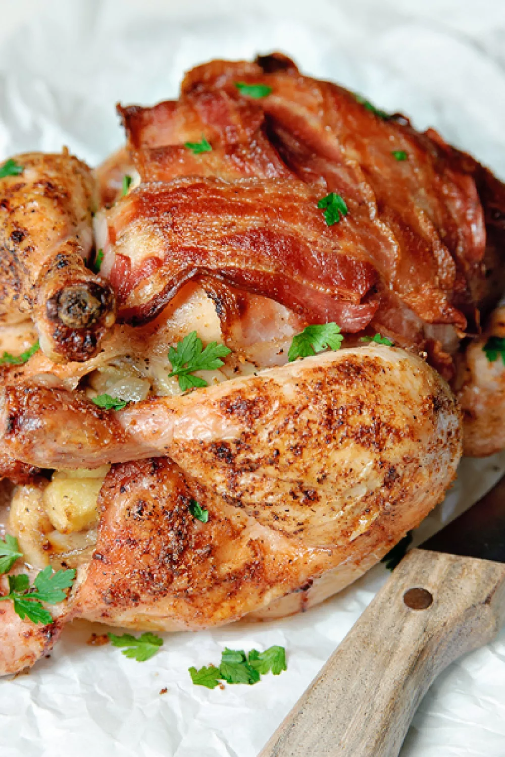 Plaats de kip op een rooster in de voorverwarmde oven en zet er een schaal gevuld met water onder om het vet in op te vangen. Rooster de kip in ca. 90 minuten gaar tot de bacon bruin en knapperig is.