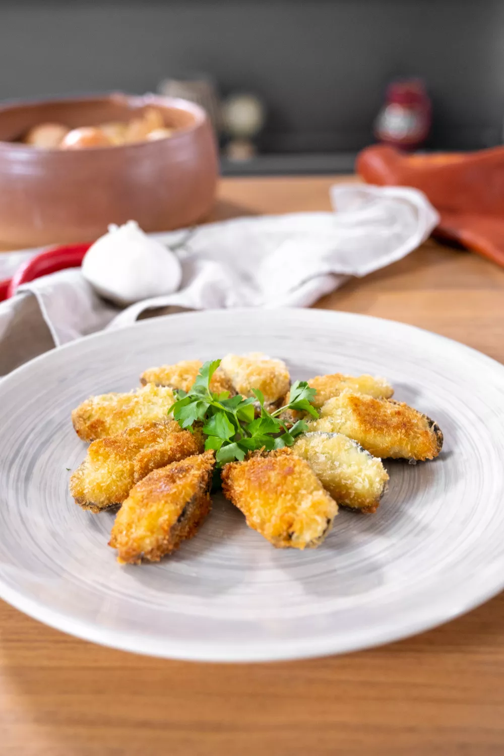 Knapperig gefrituurde gevulde mosselen met een romige mosselbechamel, omhuld door een krokant panko jasje. De vulling combineert mosselgroenten en laurier met een vleugje cayenne en gerookt paprikapoeder voor een hartige, subtiel pittige smaak. Perfect als feestelijk voorgerecht of zomers borrelhapje voor liefhebbers van zeevruchten en krokante snacks.