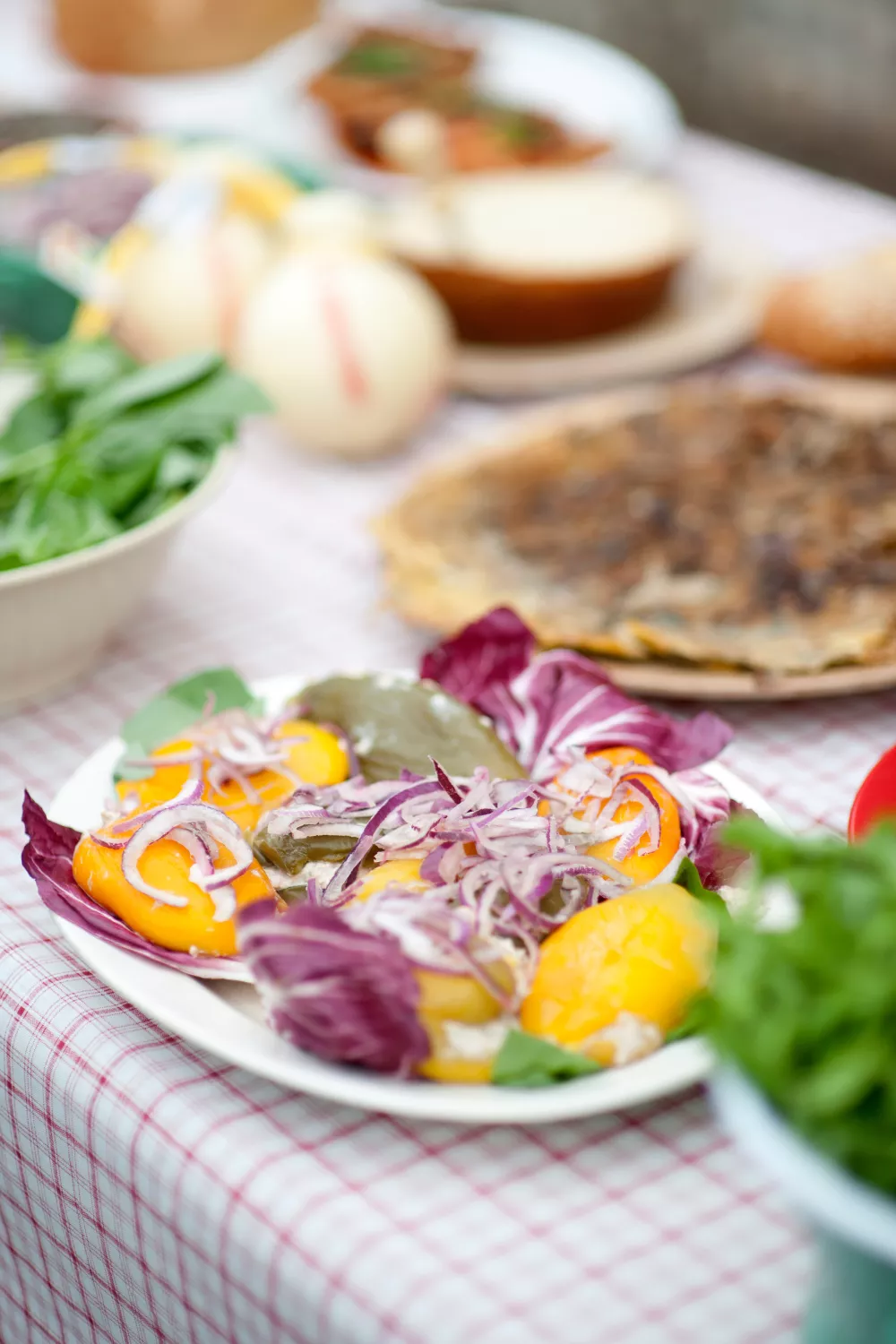 Vul de paprika's op met dit mengsel en werk af met de resterende sliertjes ui.