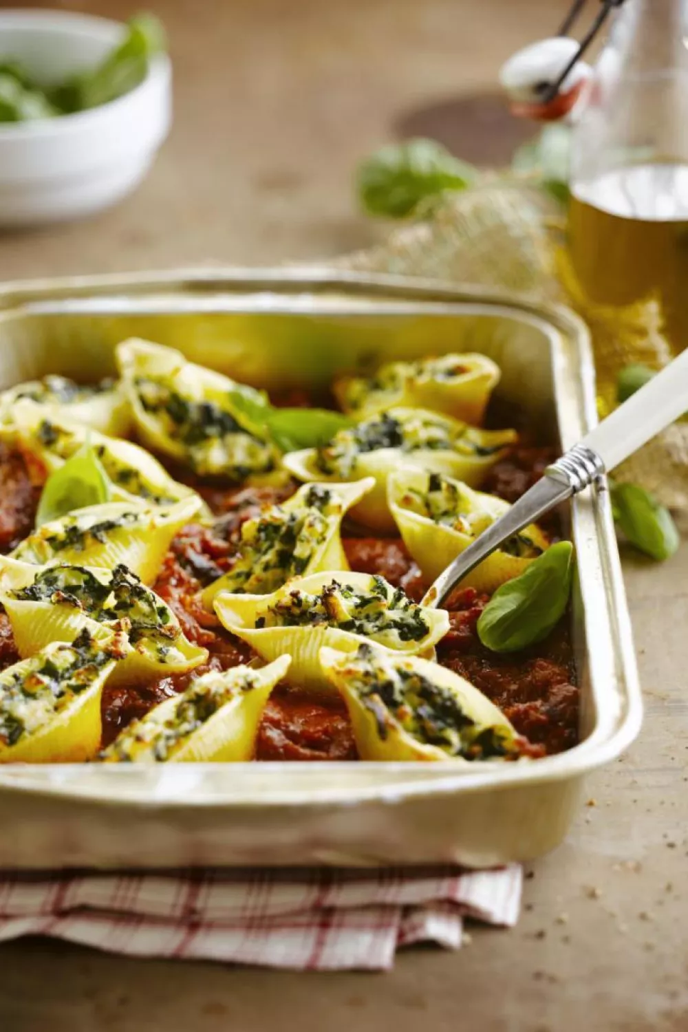 Zachte gevulde jumbo pastaschelpen met witvis, ricotta en jonge spinazie in een geurige tomatensaus, een mediterraan geïnspireerde ovenpasta die ideaal is voor een gezellig familiediner in lente en zomer. De tomatensaus wordt rustig gesudderd met basilicum en laurier, de schelpen kort voorgekookt en daarna gevuld en gebakken tot de kaas smelt. Gebruik courgette, lente-ui en emmentaler voor extra bite en smaak.