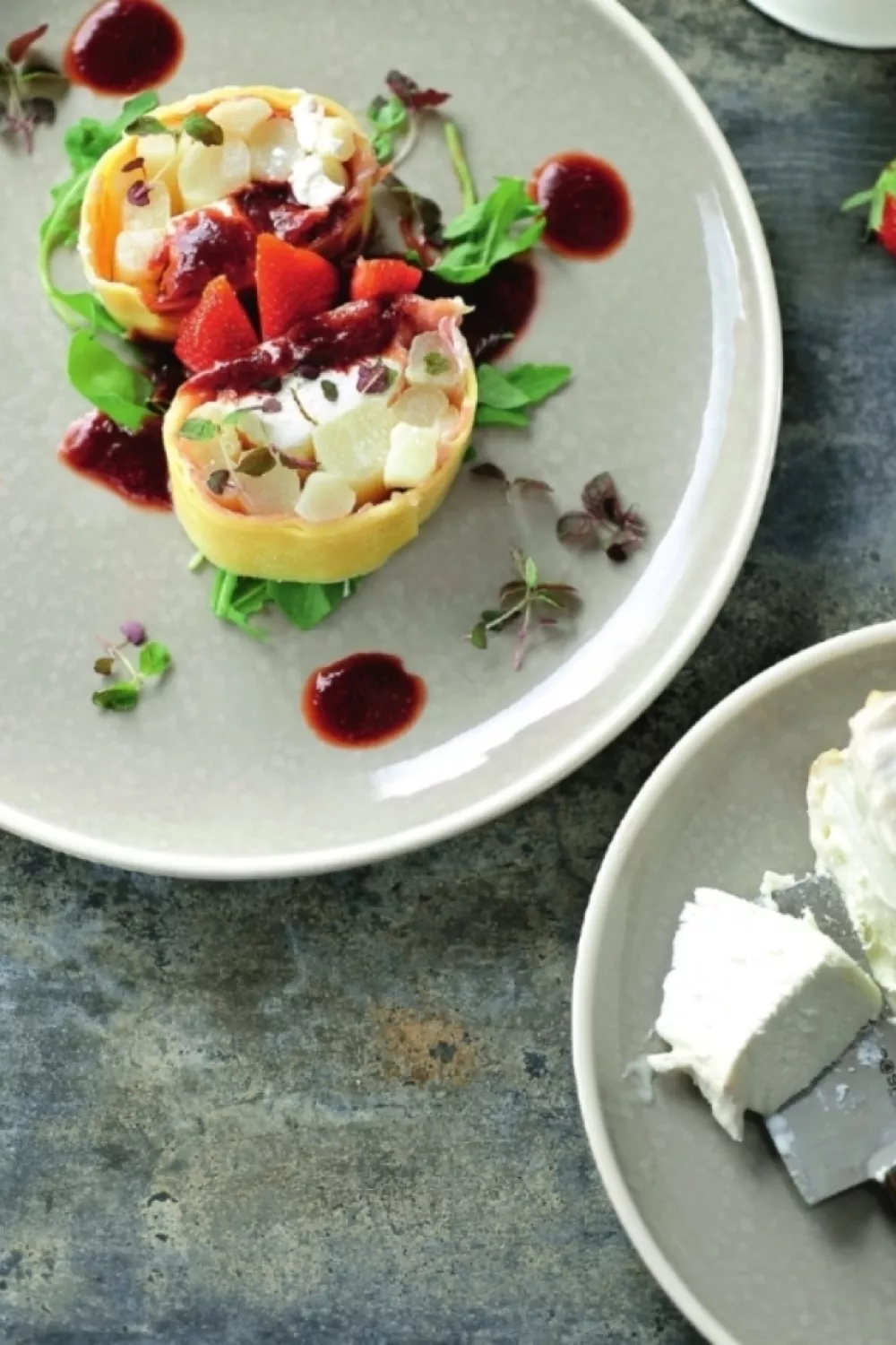 Zachte huisgemaakte pastarollen gevuld met romige geitenkaas en knapperige witte asperges, afgewerkt met een frisse aardbei-balsamico dressing. Het pastadeeg van semola wordt dun uitgerold en kort gegaard in het aspergewater, waarna je het oprolt tot elegante plakjes voor een lichte lente- of zomerlunch of een verfijnd voorgerecht. Met olijfolie en rucola krijgt het gerecht een mediterrane toets die perfect past bij een zonnige maaltijd met vrienden.