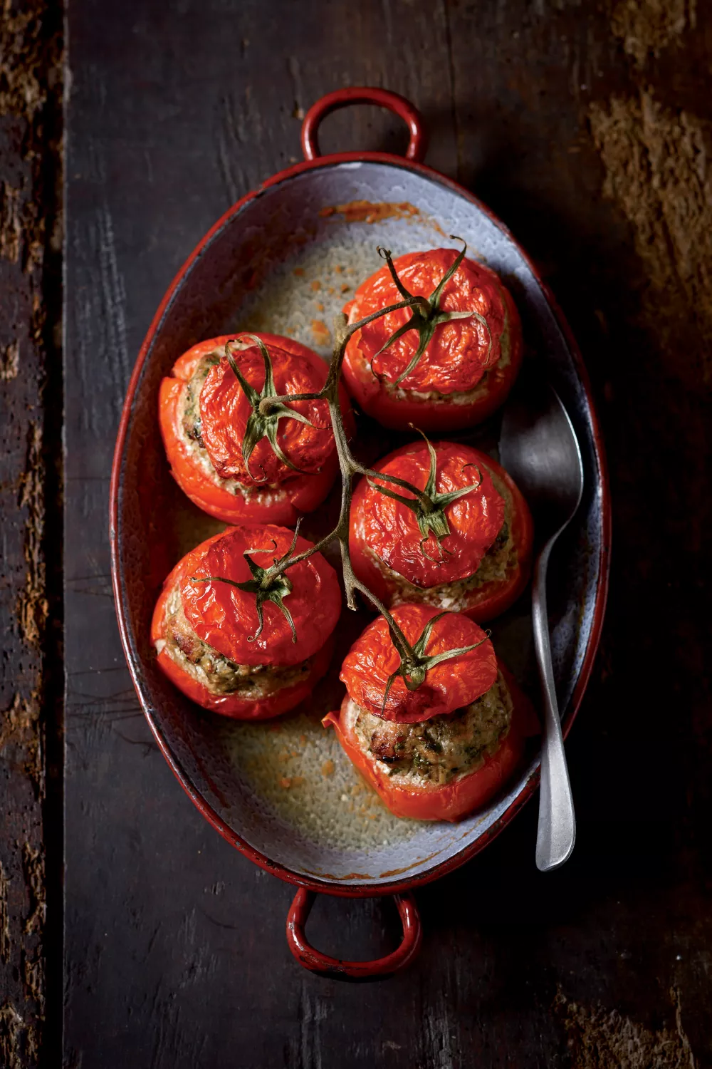 Rijk gevulde tomaten met varkensvlees en kalfsvlees, champignons en ui brengen een hartige, huiselijke smaak op tafel. Het gehaktmengsel wordt fijngemalen met de voedselmolen, in de tomaten geschept en samen met kleine balletjes en de tomatenpulp in de oven gegratineerd tot goudbruin. Perfect als zomers hoofdgerecht of gezellig familiegerecht.