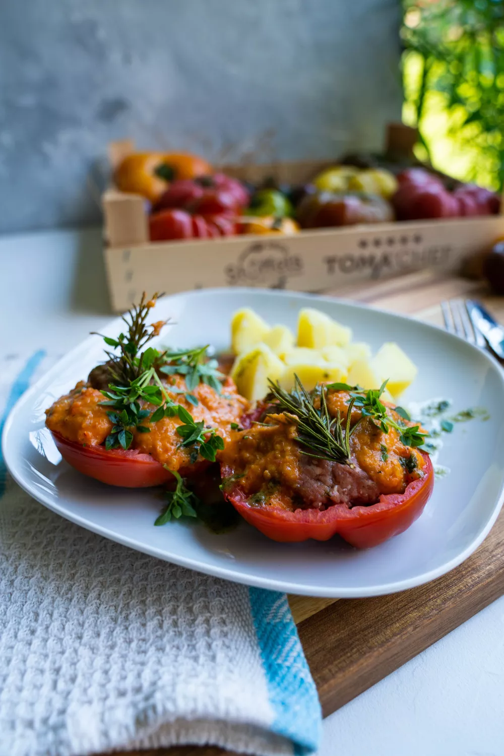 Gevulde tomaten met aardappelen en gekruid gehakt brengen zomerse mediterrane smaken op tafel, met pitakruiden, rozemarijn en basilicum in de hoofdrol. De tomaten worden kort geroosterd in de oven terwijl een gestoofde tomatensaus en een romige pesto van pijnboompitten en olijfolie het gerecht afmaken. Een toegankelijk, licht gerecht dat werkt als snelle lunch of feestelijk bijgerecht bij warme zomermaaltijden.