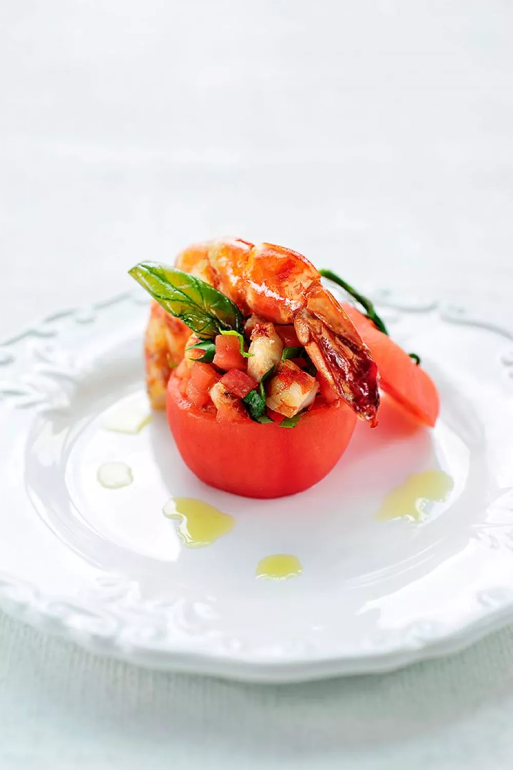 Gevulde tomaten met gamba's en basilicum