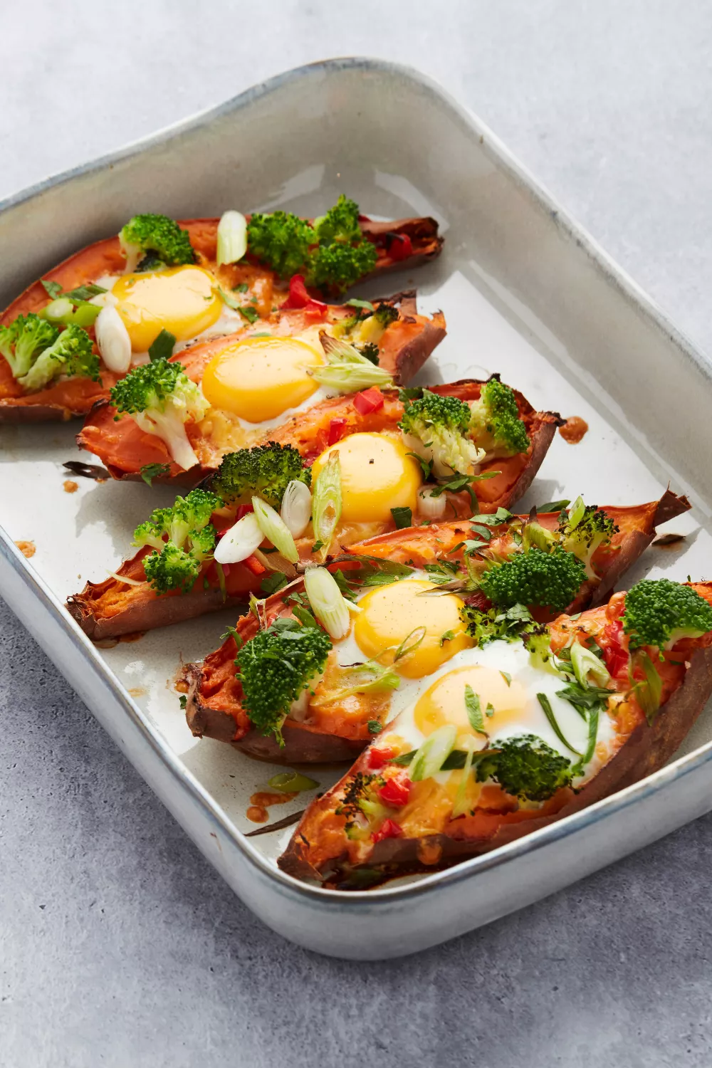 Deze gevulde zoete aardappelen met eitjes vormen een hartige, voedzame ovenschotel boordevol broccoli, paprika en cheddar. Door de zoete aardappel eerst te roosteren en daarna te vullen met een romige vulling ontstaat een licht krokante buitenkant en een zacht, smeuïg hart. Ideaal als verwarmende lunch of weekendbrunch in het herfstige seizoen en ook prima voor een snelle doordeweekse avondmaaltijd.