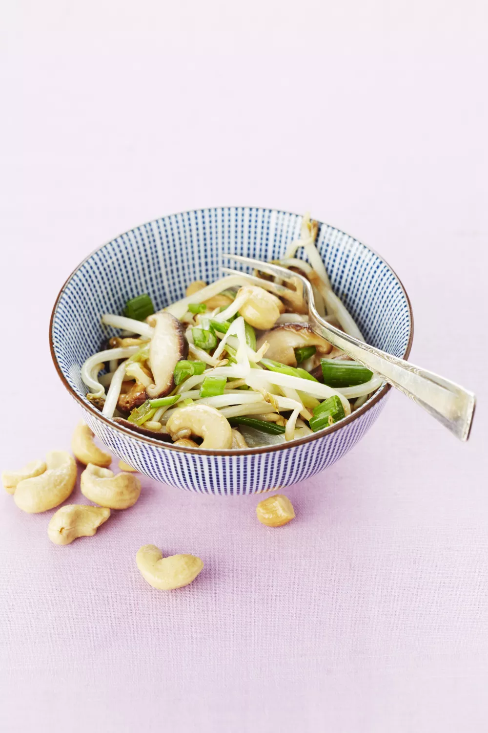 Voeg de cashewnoten toe en schep om. Werk af met de fijn gesnipperde lente-ui en eventueel wat sesamolie. Serveer meteen.