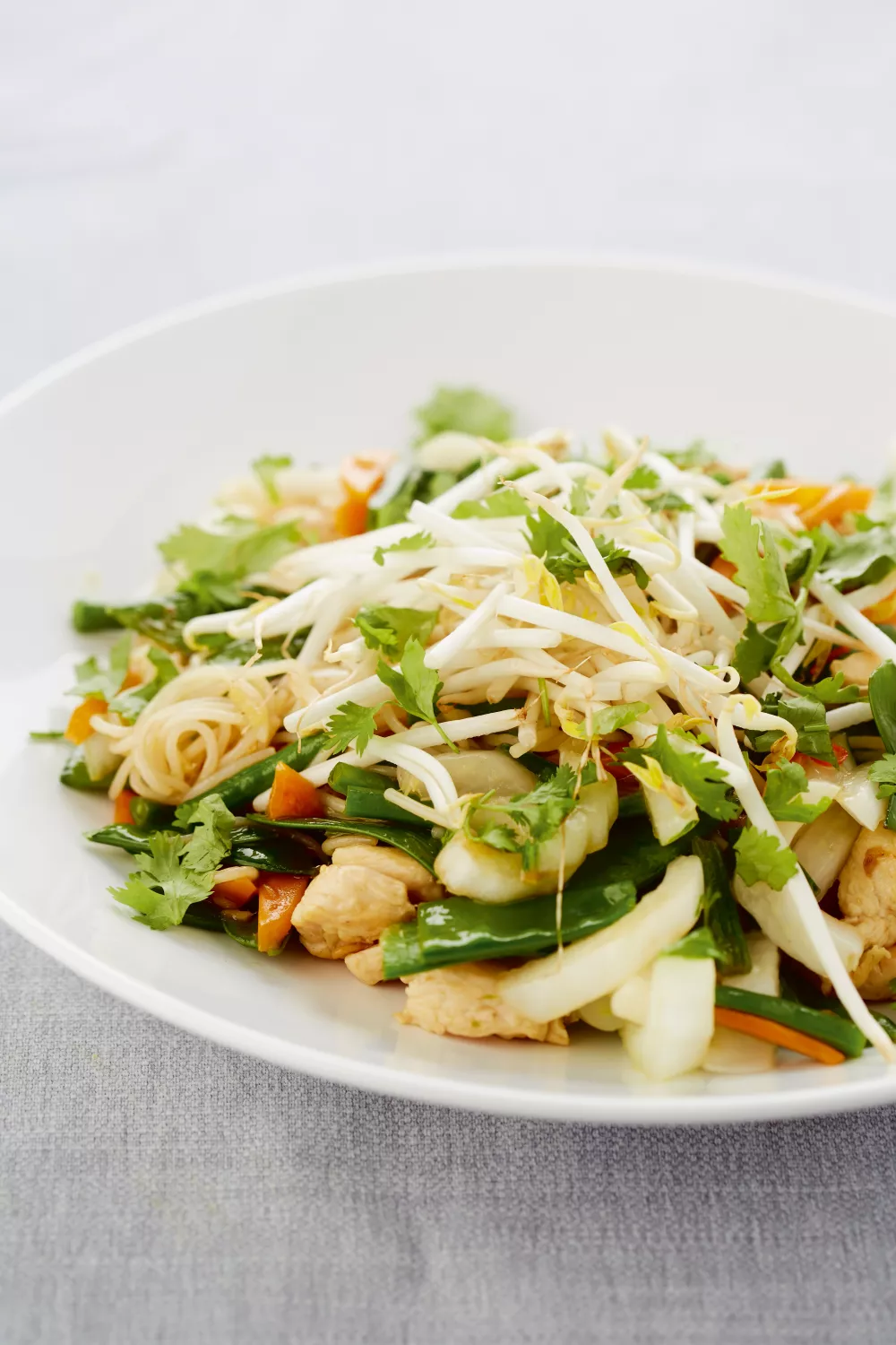 Deze snelle wokschotel combineert malse kip met knapperige boontjes, peultjes, wortel en frisse paksoi, op smaak gebracht met gember, chili, sesamolie en oestersaus. De Chinese mie neemt de volle umami op, afgemaakt met sojascheuten en koriander voor frisheid. Ideaal als roerbakgerecht voor een snelle weekmaaltijd of lichte lente of zomeravond.