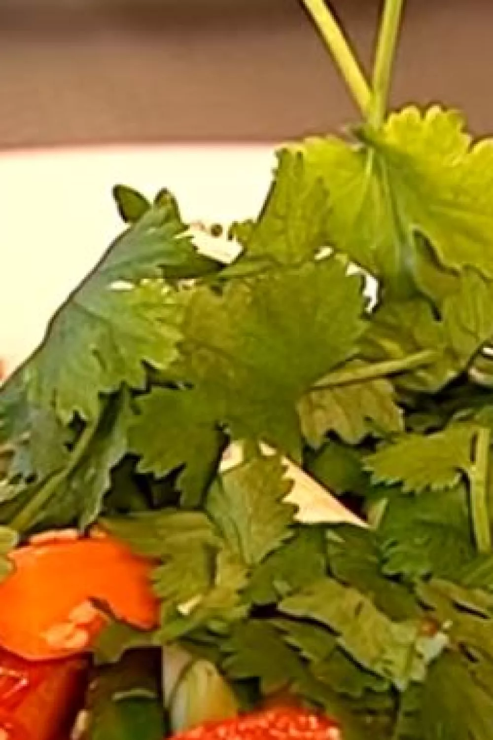 Snijd de lente-uitjes en koriander fijn en werk hiermee de wokschotel af.