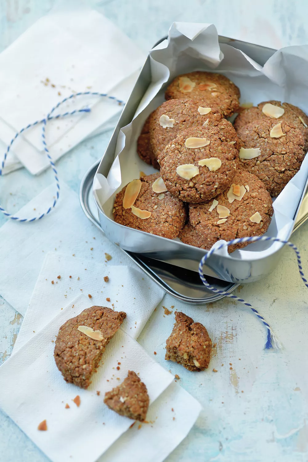 Verwarm de oven voor op 170 graden. Doe de havermout, amandelen, kokosbloesemsuiker, speculaaskruiden, kaneel, het zout en natriumbicarbonaat in een blender en mix fijn. Smelt de kokosolie en meng in een kom met de amandeldrink, de amandelpasta en de ahornsiroop. Voeg toe aan je geblende havermix. Gebruik twee lepels om koekjes van het deeg te maken, verdeel ze – voldoende uit elkaar – over een bakplaat. Strooi wat van de amandelschilfers over de koekjes. Zet 10 minuten in de oven op 170 graden, of tot ze lichtjes kleuren (want de ene oven is de andere niet). Haal de koekjes uit de oven en laat ze volledig afkoelen.