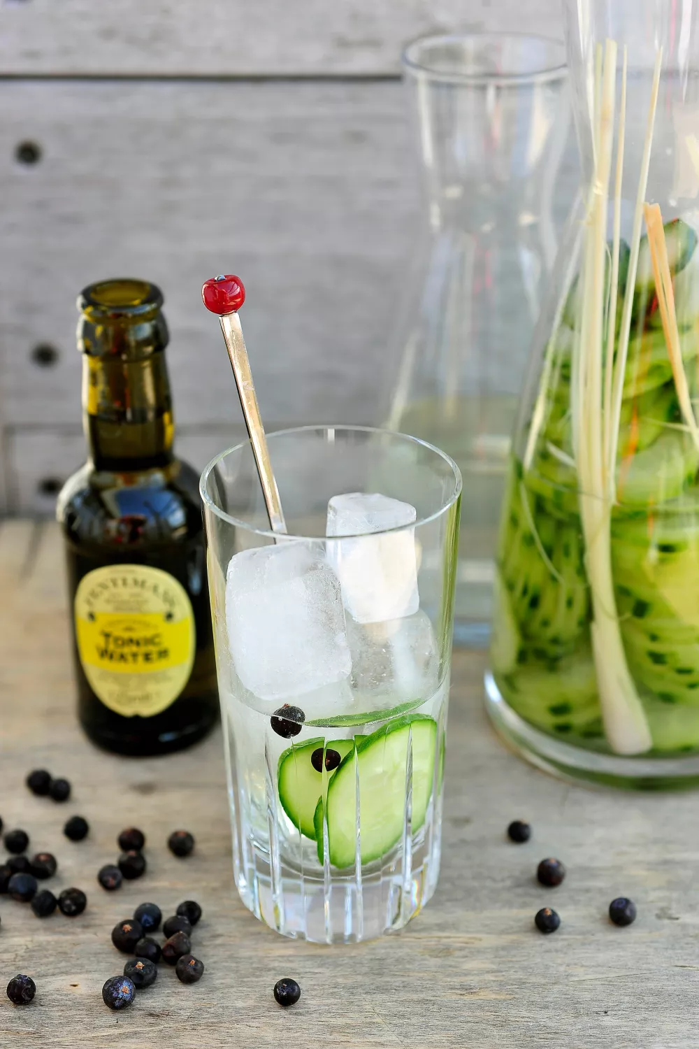 Vul het Collinsglas met ijsblokjes, giet er de komkommer-citroengrasgin op, vul aan met tonic en werk af met komkommer en jeneverbesjes. Serveer met een roerstaafje.