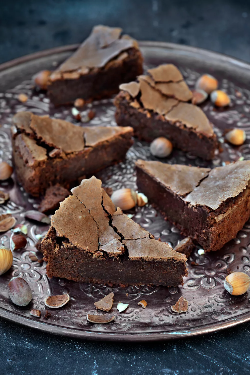 Klop de eieren samen met de suiker luchtig tot de massa verdriedubbeld. Smelt de chocolade en boter in de microgolf en voeg deze massa voorzichtig toe aan de eieren. Spatel als laatste het hazelnootpoeder, de maïzena en het zout eronder.