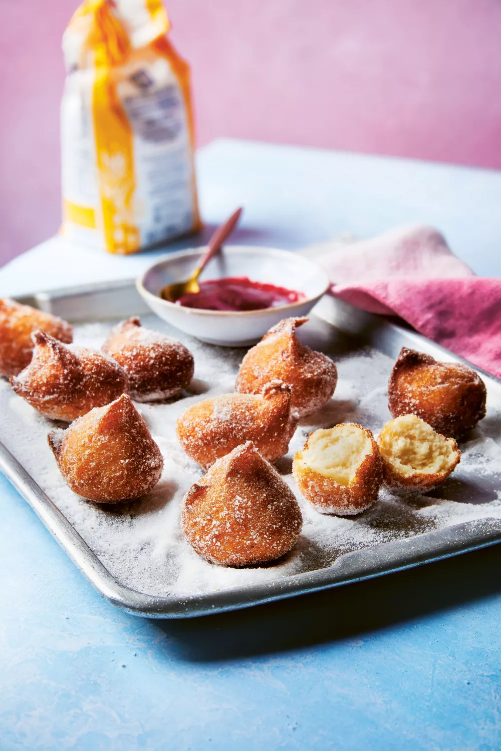 Schep ze met een schuimspaan uit de olie en leg ze op het met suiker bedekte bord. Rol de donuts door de suiker en laat ze op een rooster even afkoelen. Ga door tot het beslag op is en rol elke gebakken portie door de suiker. Geef er frambozen- of aardbeienjam bij als dip.