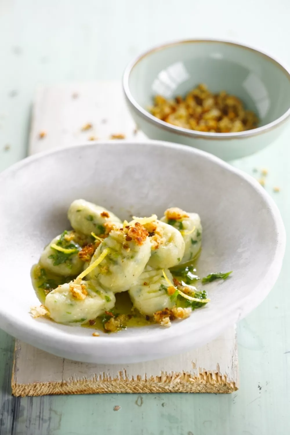 Serveer de gnocchi met de crumble en eventueel wat extra geraspte citroenschil.