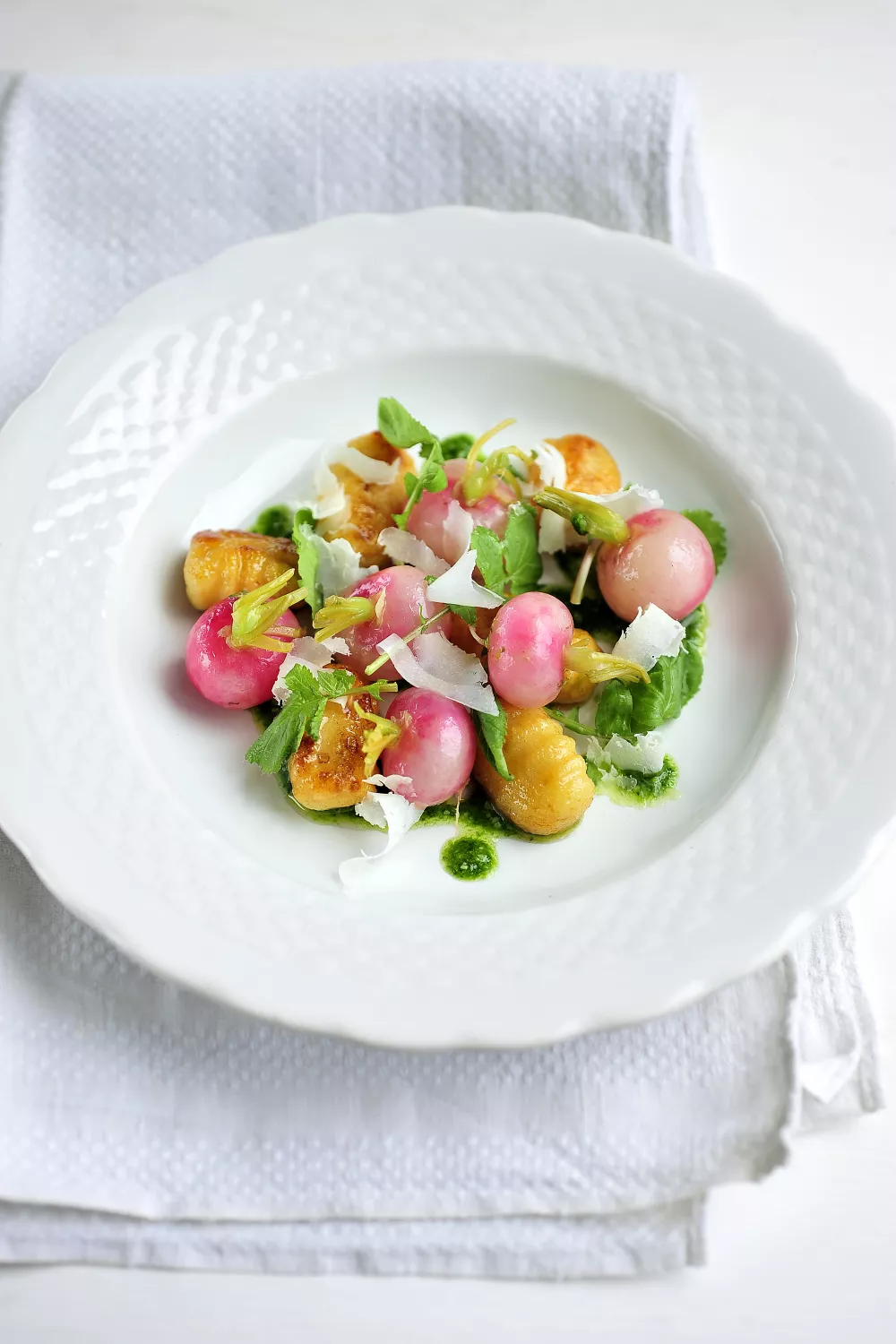 Gnocchi met radijsjes en pesto van radijssteeltjes