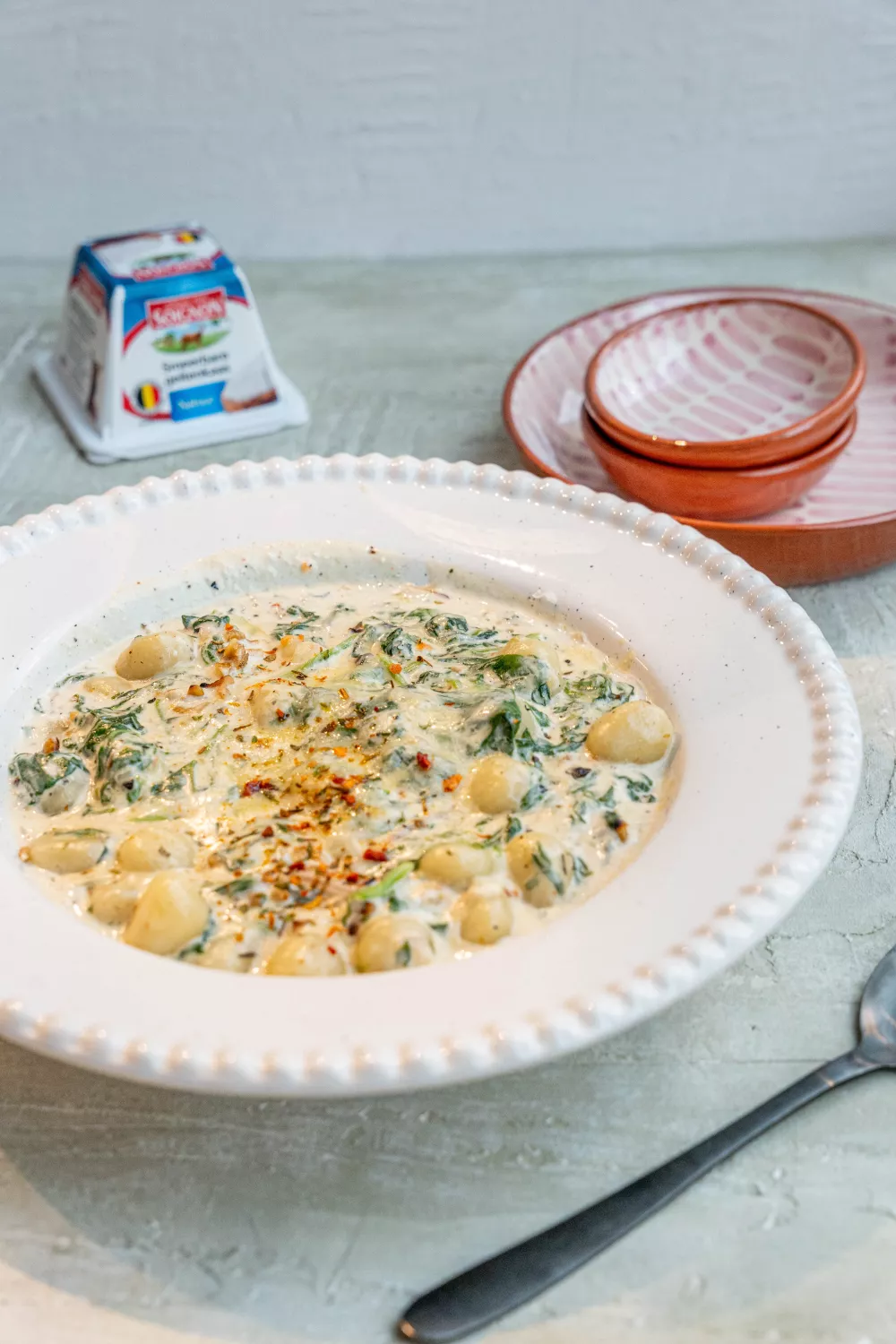 Gnocchi met romige spinazie kaassaus, geitenkaas en krokante okkernoten is een snel vegetarisch comfortgerecht boordevol hartige smaken en rijke texturen. De saus maak je door spinazie te blancheren en te stoven met sjalot en gezouten boter, daarna op te smelten met Soignon geitenkaas en room voor een fluweelachtige textuur. Afgewerkt met geroosterde okkernoten en geraspte oude kaas is dit recept perfect voor doordeweekse diners in alle seizoenen.