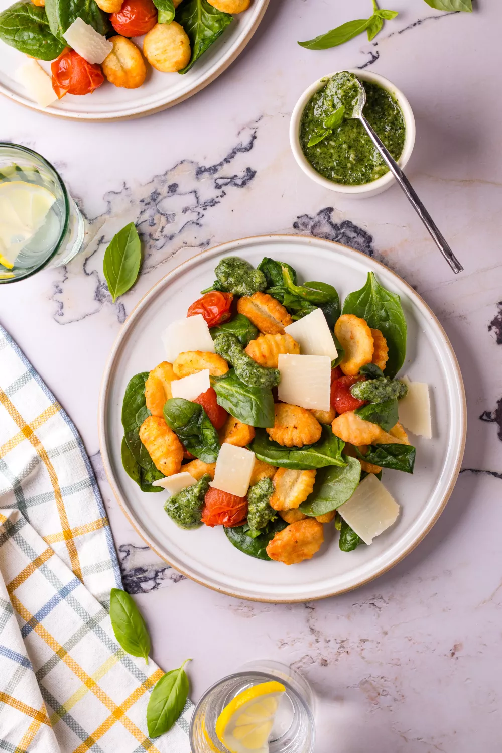 Meng de spinazie door de gnocchi en serveer met de pesto en eventueelnog wat extra Parmezaanse kaas.