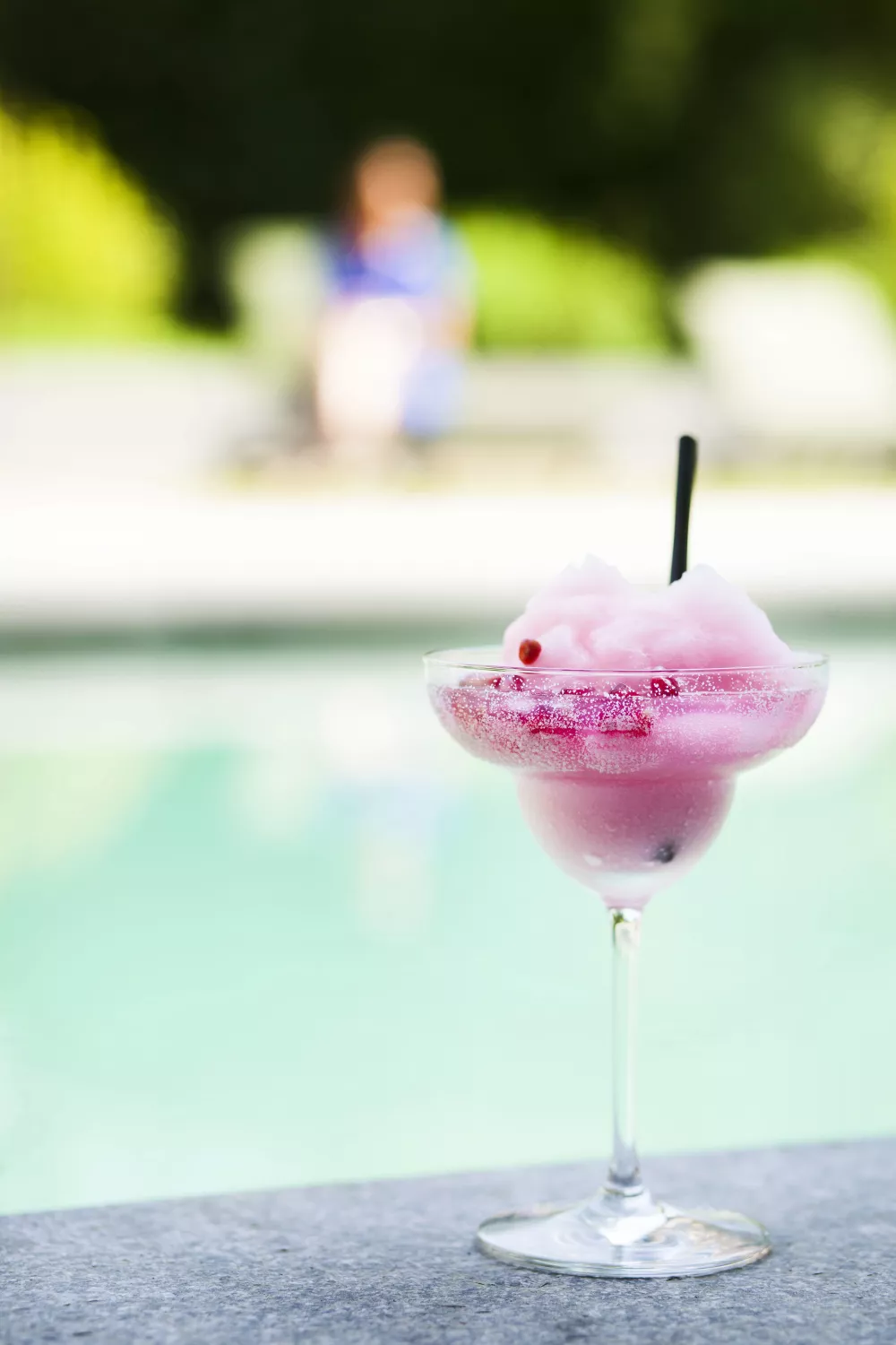 Garneer de cocktail met granaatappelpitjes en serveer met een rietje.