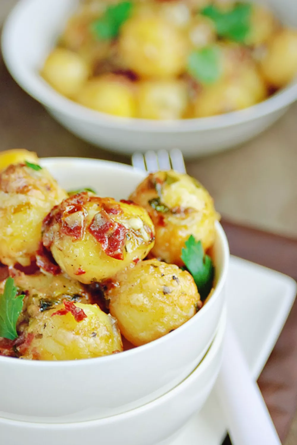 Deze romige gratin van krieltjes met zongedroogde tomaat en krokant ontbijtspek is een hartig bijgerecht dat troost en smaak brengt op tafel. Een romige saus van boter, bloem en room met basilicum en peterselie omhult de aardappelen voordat een goudbruine laag jonge kaas in de oven smelt. Perfect voor herfstige diners, een weekendmaaltijd of als smaakvolle toevoeging bij een gezellige borrel.