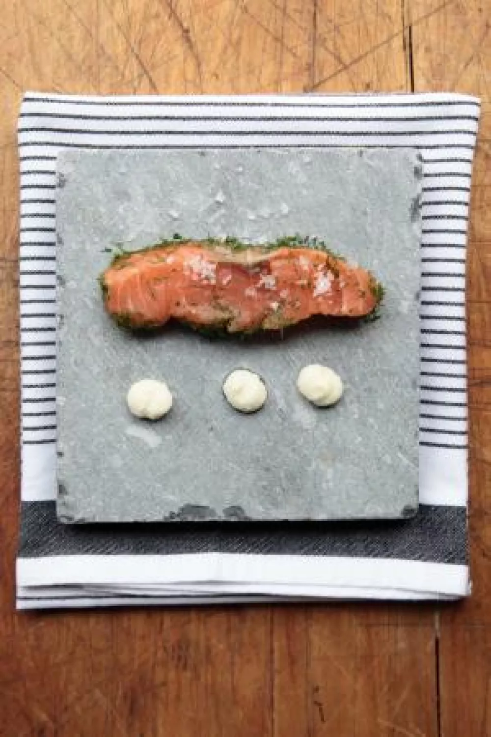 Verwijder alle resterende graten uit de zalm met een pincet. Smeer in met zout, suiker en dille. Verpak in huishoudfolie, druk goed aan en leg min. 1 dag in de koelkast.