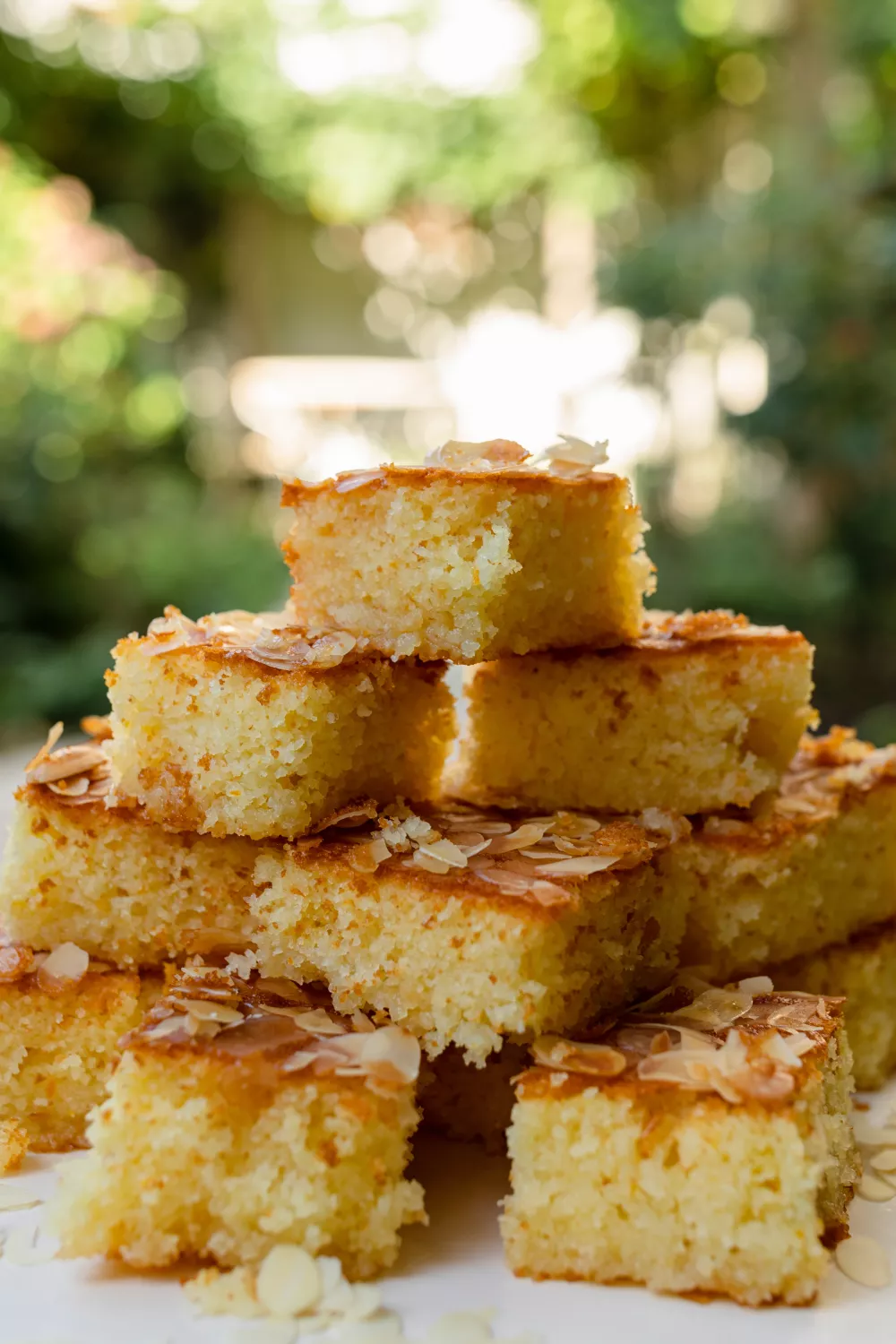 Deze griesmeeltaart met amandel en sinaasappel combineert een zachte, licht korrelige structuur met warme suikersiroop tot een smeuïge, aromatische traktatie. Het eenvoudige beslag van griesmeel, yoghurt, olie en eieren mag even rusten, wordt goudbruin gebakken en royaal overgoten met hete siroop waarna geroosterde amandelschaafsel voor een knapperige toets zorgt. Hij is ideaal bij de koffie, als feestelijk dessert of op een koele herfstmiddag.