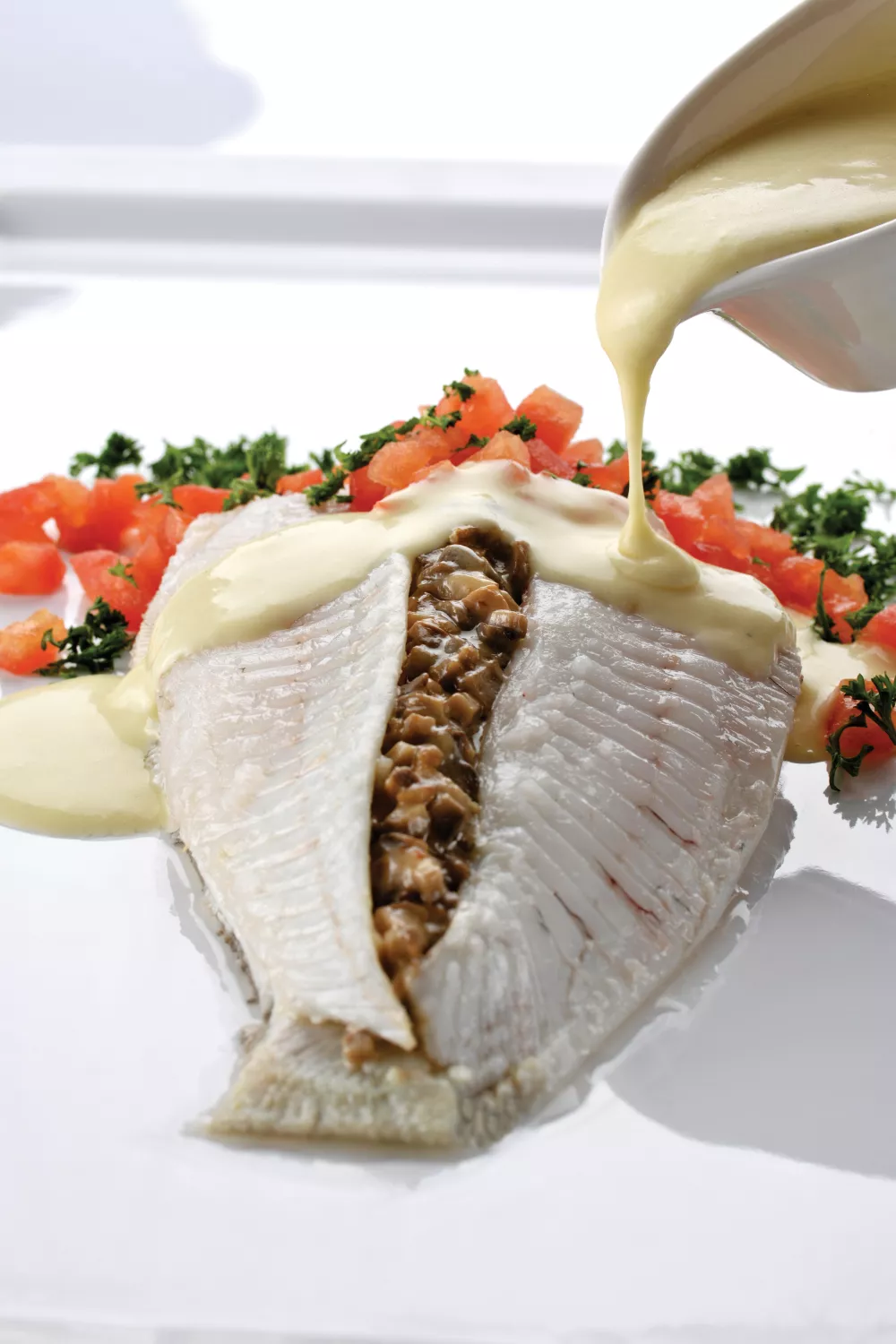Dit elegante visgerecht combineert zachte grietbot met een smeuïge paddenstoelenduxelles en een romige trappistsaus voor extra bitterzoete diepte. De vis wordt zachtjes in gevogeltebouillon gegaard in de oven, de champignons worden fijn gesneden en ingekookt tot een smeerbare massa en een bierroux zorgt voor body in de saus. Serveer met verse tomaten, grofgehakte peterselie en een kneepje citroen voor een herfstig of feestelijk diner.