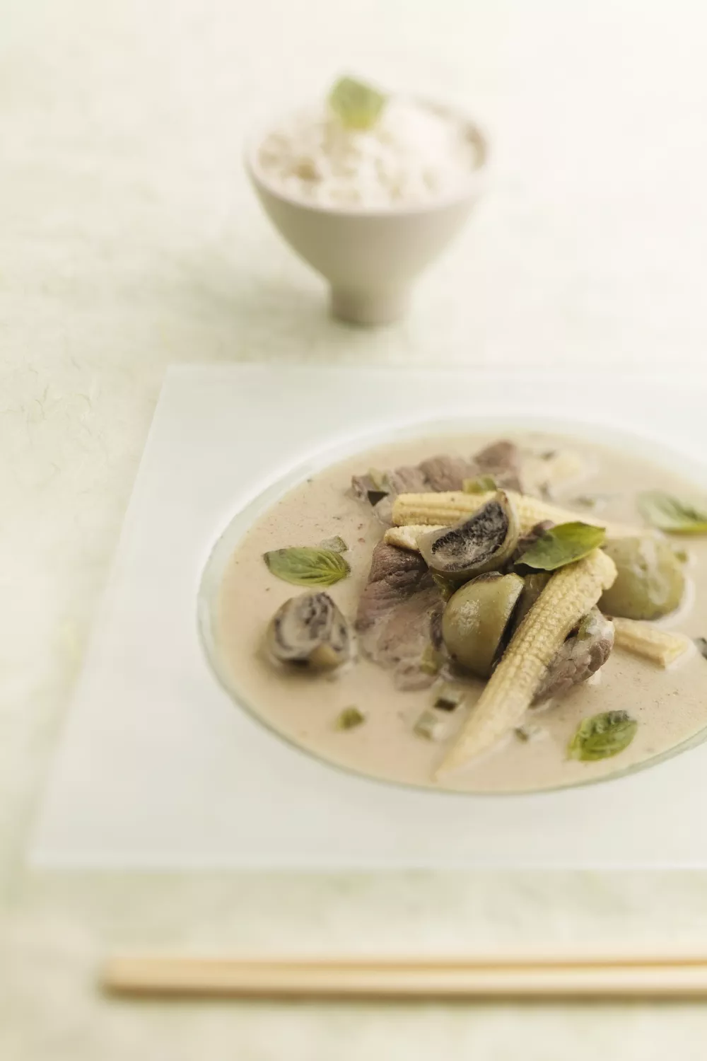 Werk de curry af met Thaise basilicum en serveer met een kommetje basmatirijst.