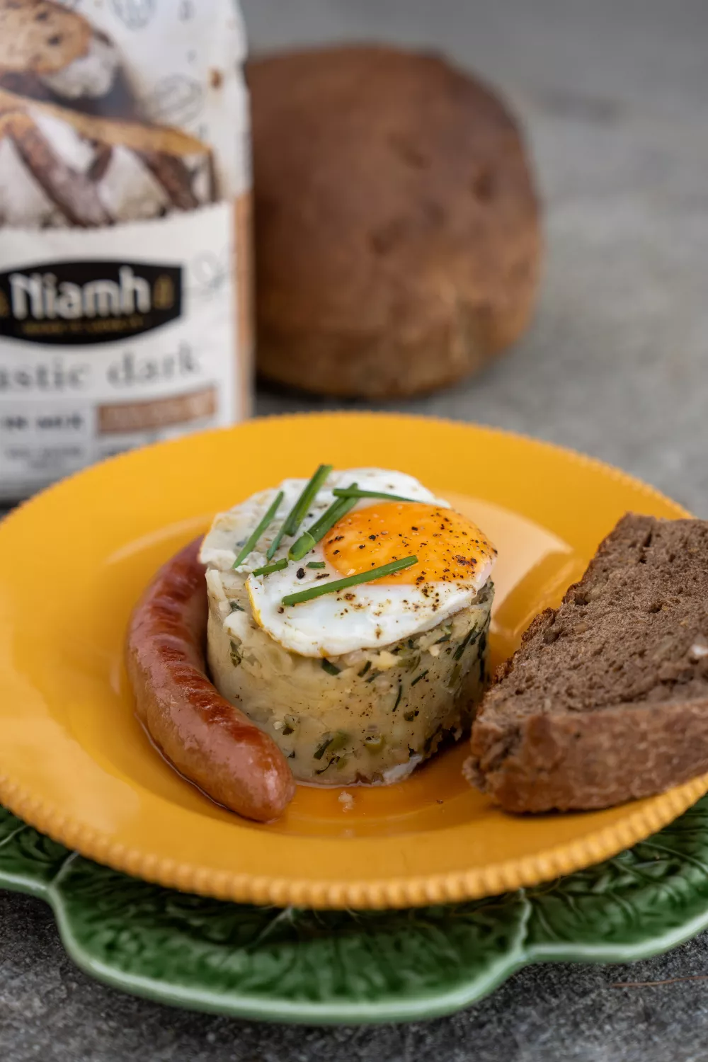 Dresseer de puree in een mooie cirkelvorm met behulp van de uitsteker. Maak een kuiltje in het midden en doe daarin een lepeltje gebrande boter. Plaats het uitgesneden spiegelei bovenop de puree. Werk af met bieslook en serveer er een stukje worst en een sneetje brood bij.