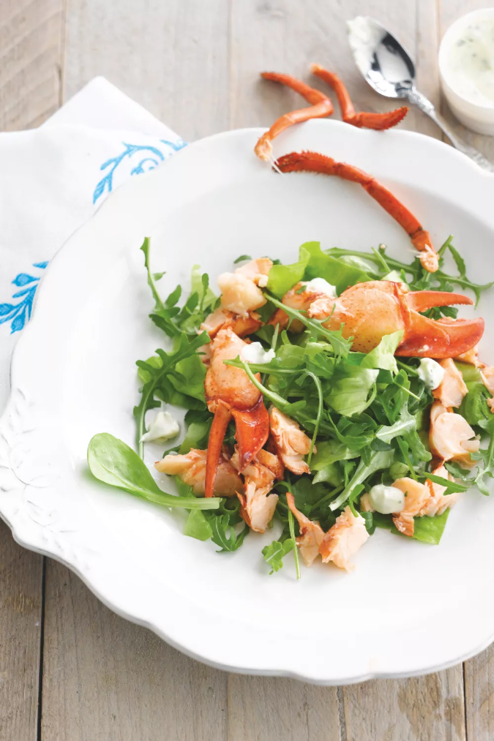 Schik de kreeft op een groot, koud bord. Lepel er de saus rond en deels over. Maak met de sla een nestje in het midden van het bord. Versier met de kleine pootjes van de kreeft.