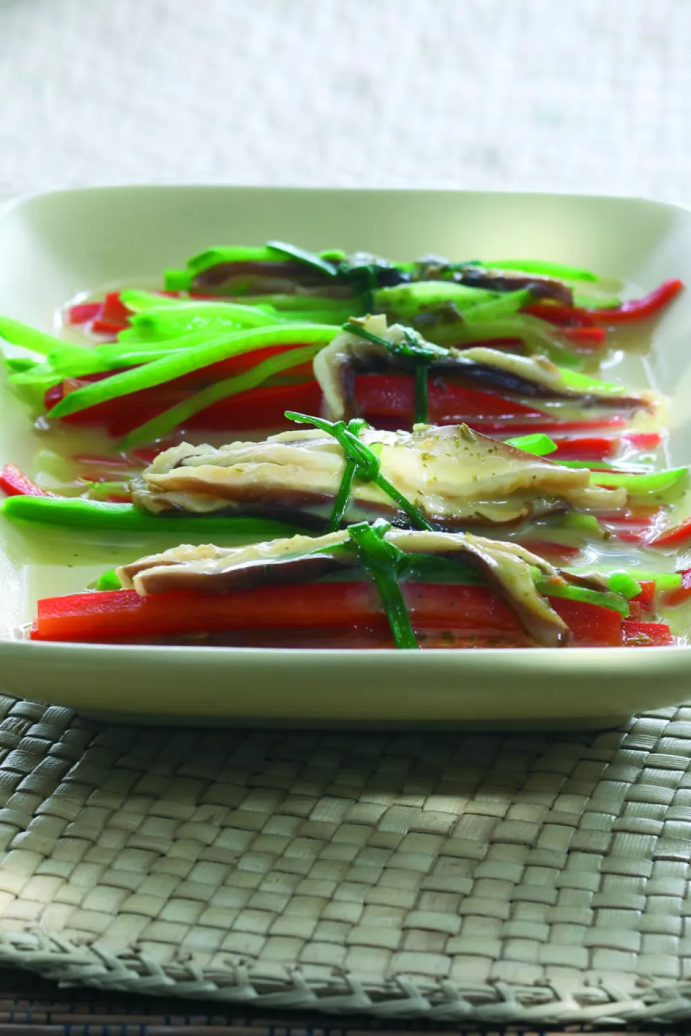Deze groentepakketjes met paprika, shiitake en peultjes worden tot kleine bundeltjes geknoopt en kort gepocheerd in een geurige groentebouillon met citroengras en kerrie. De saus krijgt een romige afwerking die het geheel elegant en licht maakt. Ideaal als feestelijk voorgerecht of kleurrijk bijgerecht in lente en zomer en ook fijn voor een snelle doordeweekse maaltijd met een vleugje Aziatische flair.