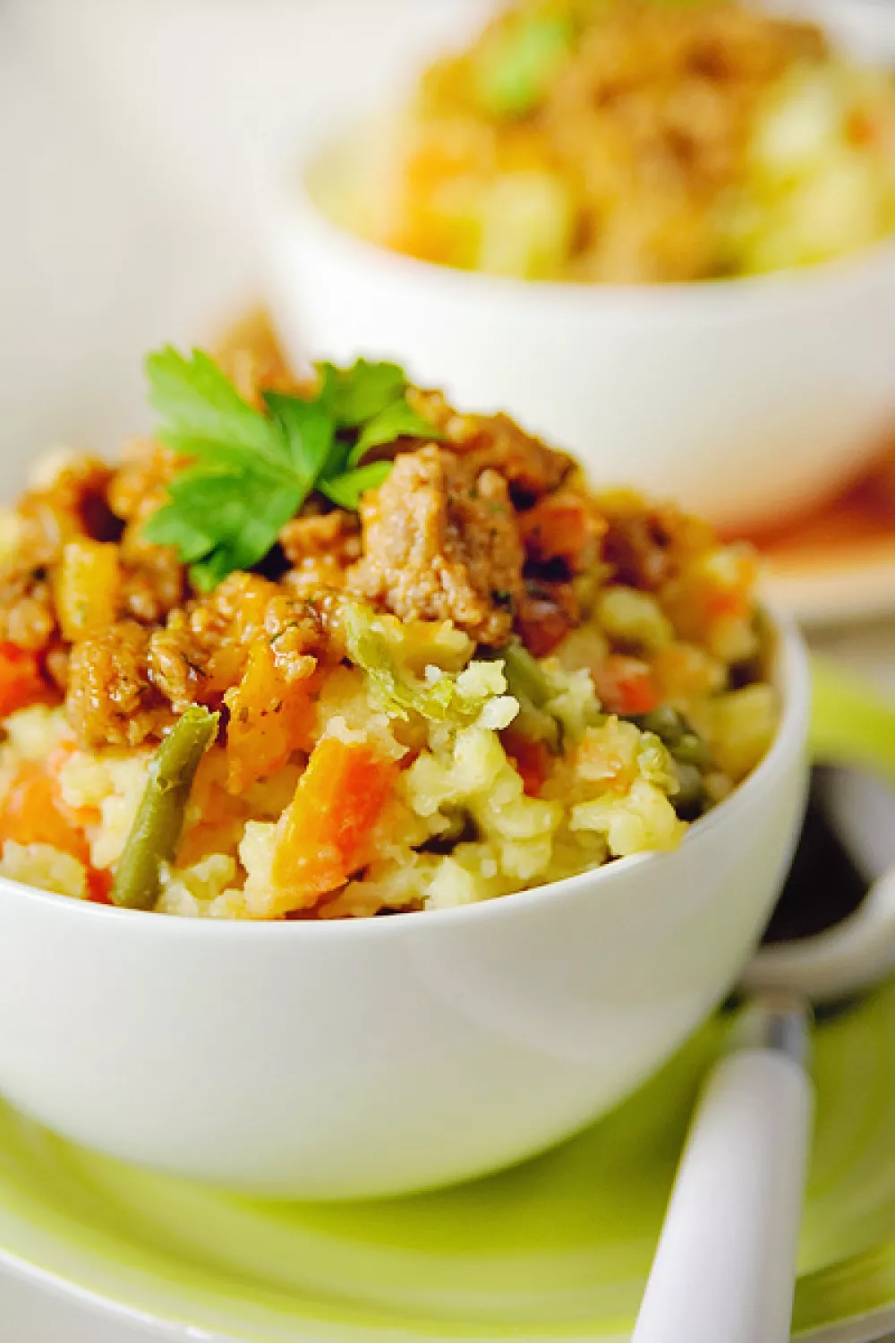 Een hartverwarmende groentepuree met vleessaus voor doordeweekse avonden en koude dagen. Romige aardappelpuree met sperziebonen en wortel wordt tot stamppot gestampt en geserveerd met een stoof van rundergehakt en spek, op smaak met ui, paprika, mosterd, ketchup, worcestersaus, peterselie en een vleug nootmuskaat. Je bakt het gehakt rul, blust met bouillon en laat sudderen tot een rijke saus ontstaat.