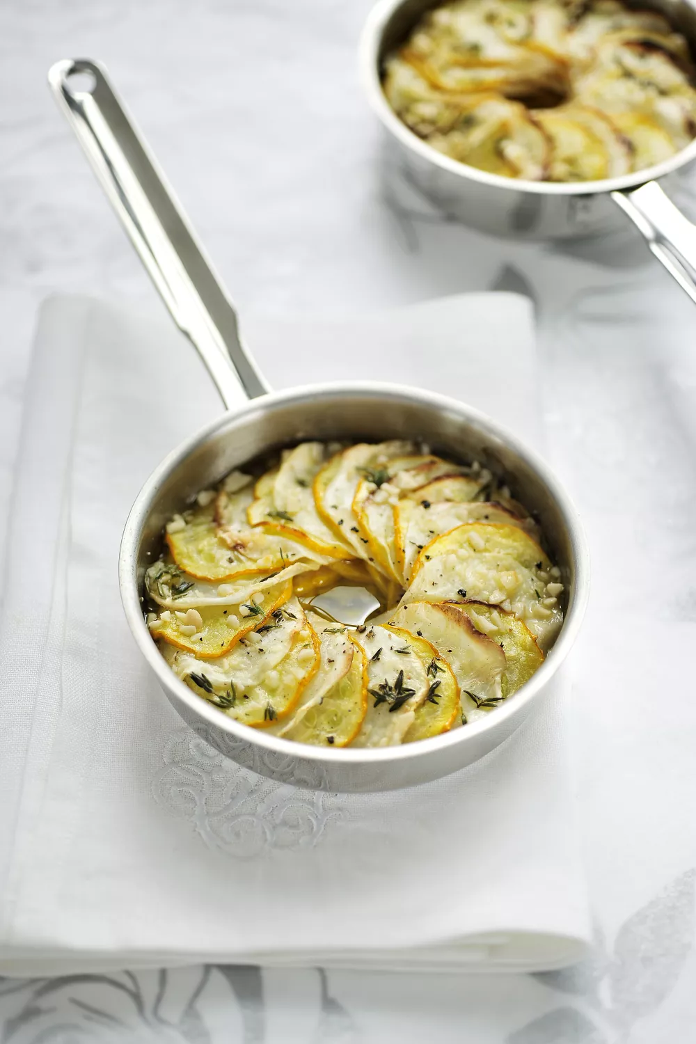 Schik de knolselder en courgette afwisselend en dakpansgewijs in vier vuurvaste schaaltjes, en maak drie tot vier laagjes. Bestrijk elke laag met wat knoflook en olie en besprenkel met wat geritste tijmblaadjes.