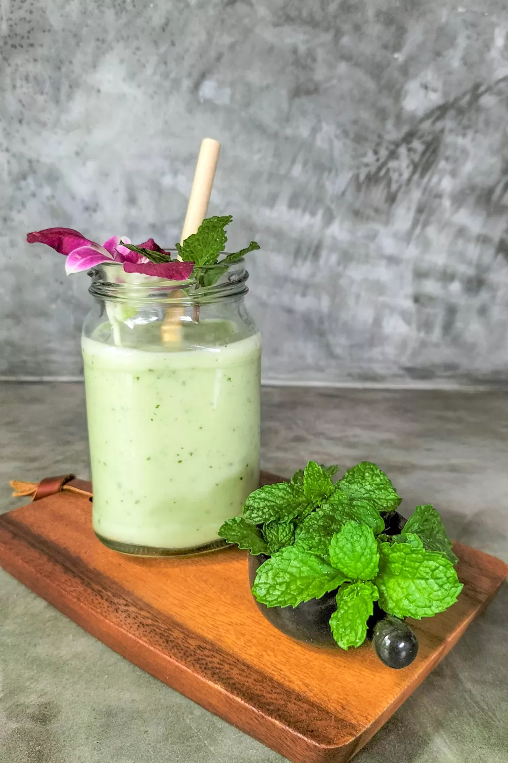 Serveer de smoothie in een leuk glas en werk af met een takje munt en een eetbaar bloemetje.