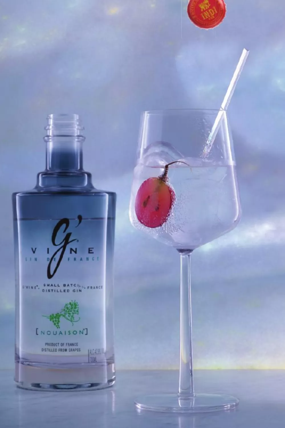 Doe een maatje gin in het glas en garneer met een blauwe druif. Overgiet met de Indi tonic.