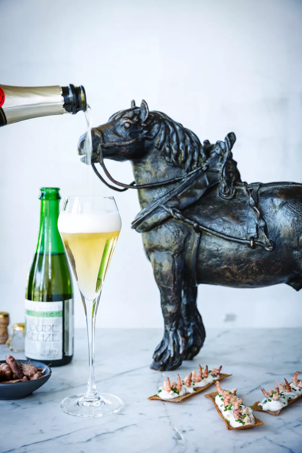 Neem een champagneglas en vul het met 1/5de geuze en 4/5de blanc de blancs.