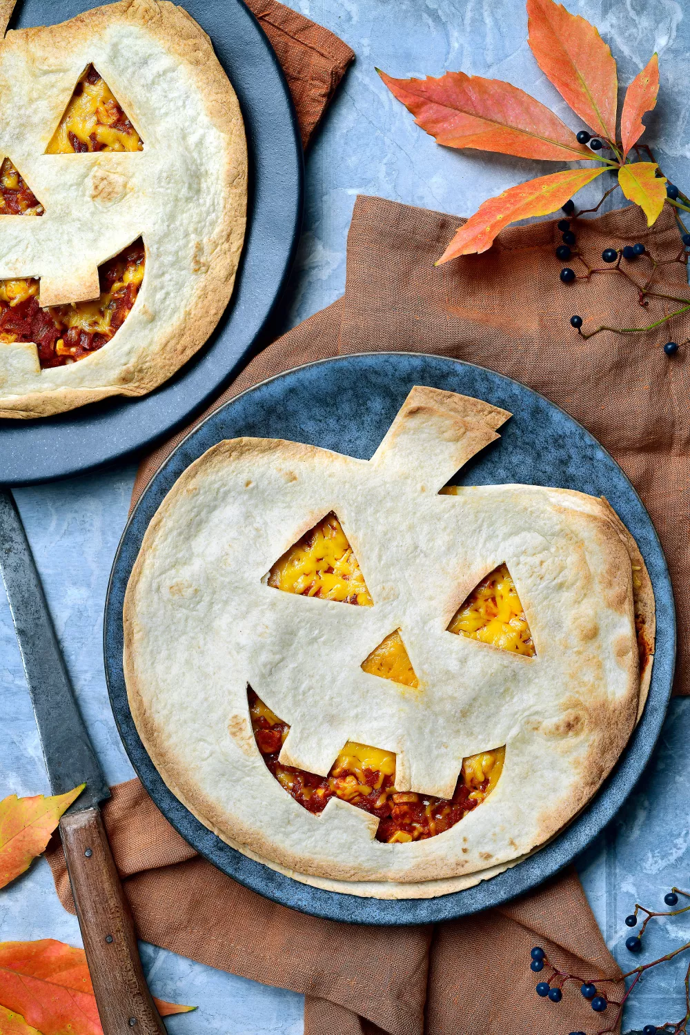 Feestelijke Halloween quesadillas met een pittige tomatensaus en gesmolten cheddar, ideaal als hartige snack voor een herfstig feestje. Ui en knoflook worden gestoofd met komijn en paprikapoeder, de saus krijgt maïs en wordt tussen wraps met uitgeknipte pompoengezichtjes gelegd en in de oven gebakken tot ze goudbruin en krokant zijn. Met dit makkelijke recept serveer je een speelse warme borrelhap die kinderen en volwassenen verrast.