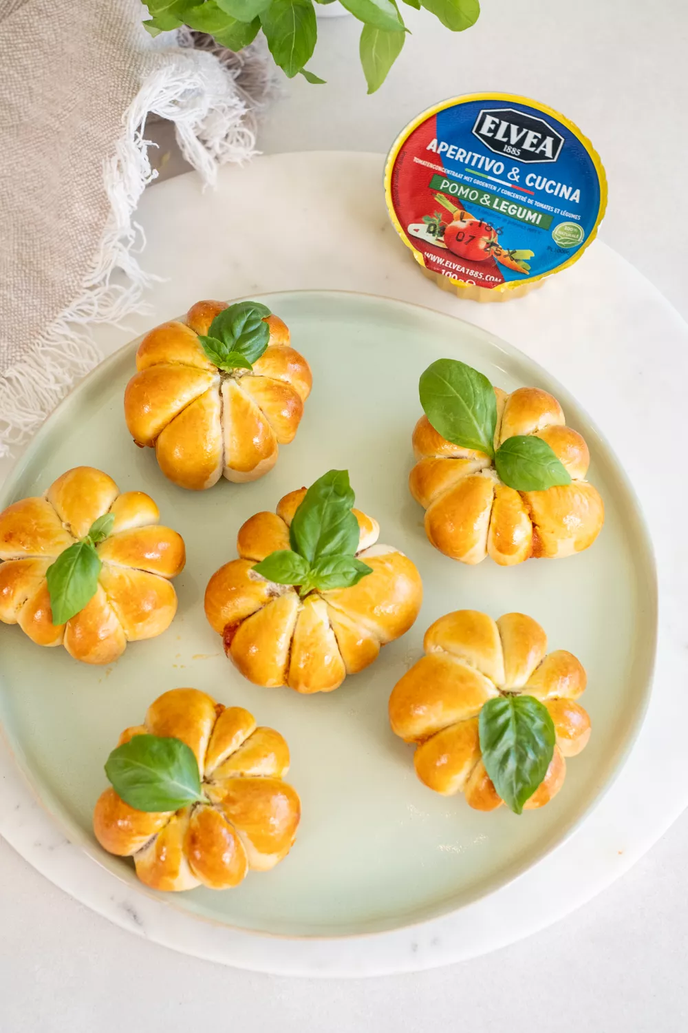 Vrolijke Halloweenpompoentjes van krokant pizzadeeg gevuld met kruidig gehakt, Elvea Pomo e Legumi en gesmolten mozzarella geven je herfsttafel meteen sfeer. Met eenvoudig deeg, een eidooier voor glans en verse basilicum bak je in de oven snel sfeervolle, feestelijke pompoentjes als borrelhap tijdens Halloween of een gezellige najaarsbijeenkomst.