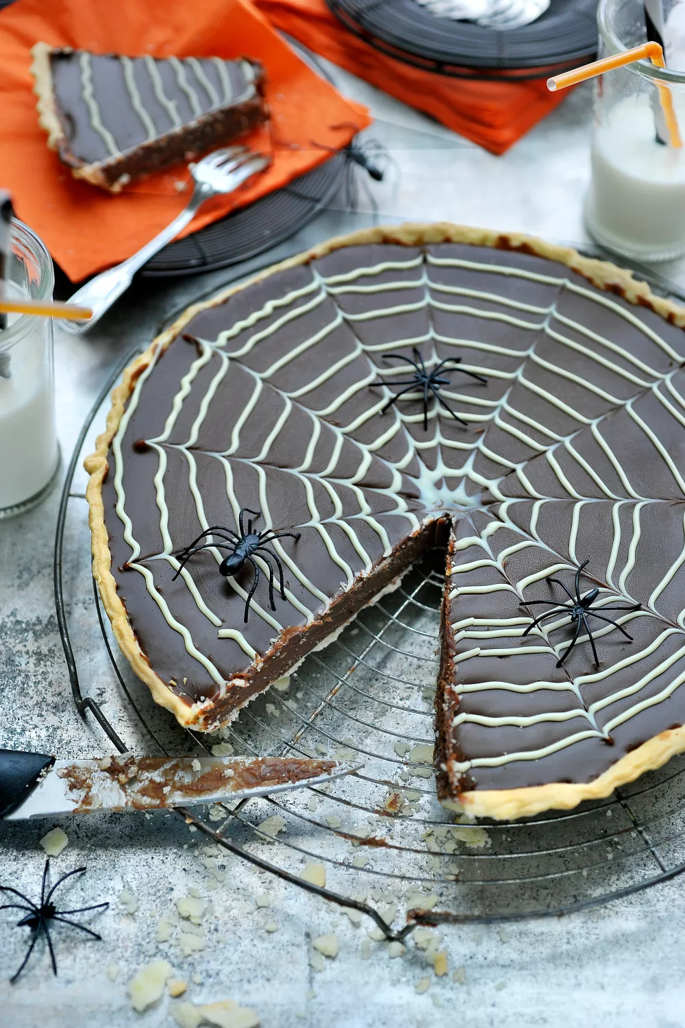 Smelt nu de witte chocolade en doe deze in een spuitzak. Knip er een klein tipje af. Teken nu met de witte chocolade een spiraal op de chocoladeganache. Trek met een mesje of een tandenstoker lijnen van het midden van de taart naar buiten toe om een spinnenweb effect te krijgen. Laat de taart nog minstens twee uur opstijven in de koelkast alvorens ze te serveren. Werk de taart optioneel af met toffe halloweendecoraties.