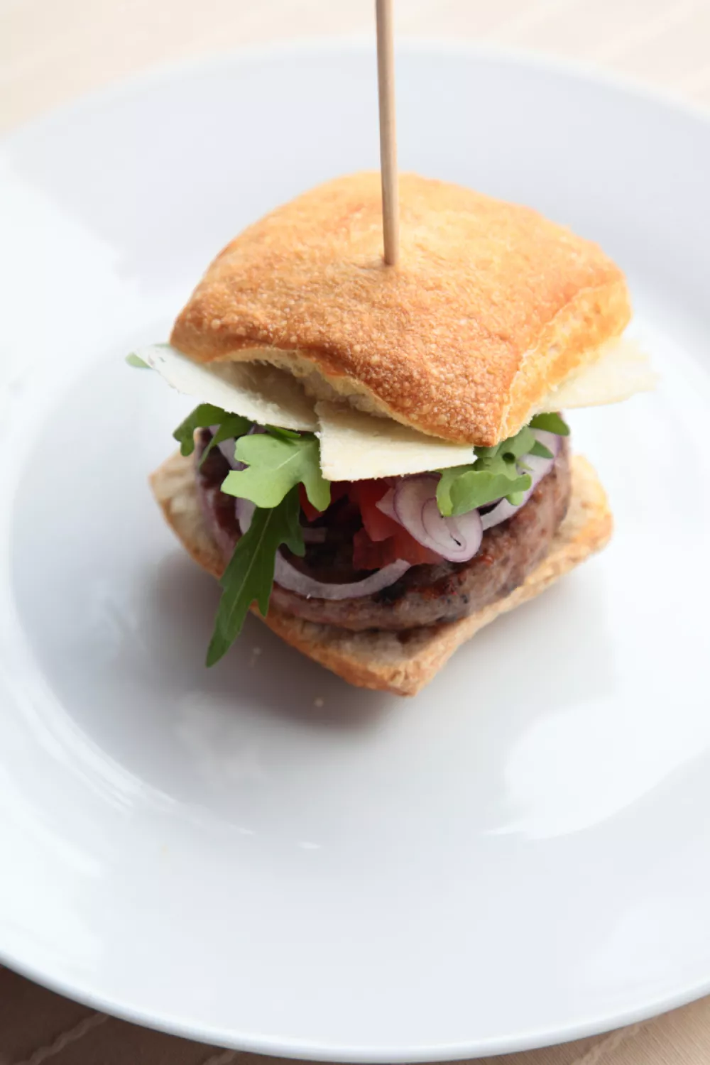 Een sappige hamburger van puur rundvlees past bij doordeweekse avond en zomerse barbecue. Gegrild vlees op goudbruin in de oven gebakken ciabatta broodjes, belegd met ringen rode ui, blokjes tomaat, rucola en schilfers Parmezaan. Simpel comfort food met Italiaanse toets, gekruid met peper en zout.