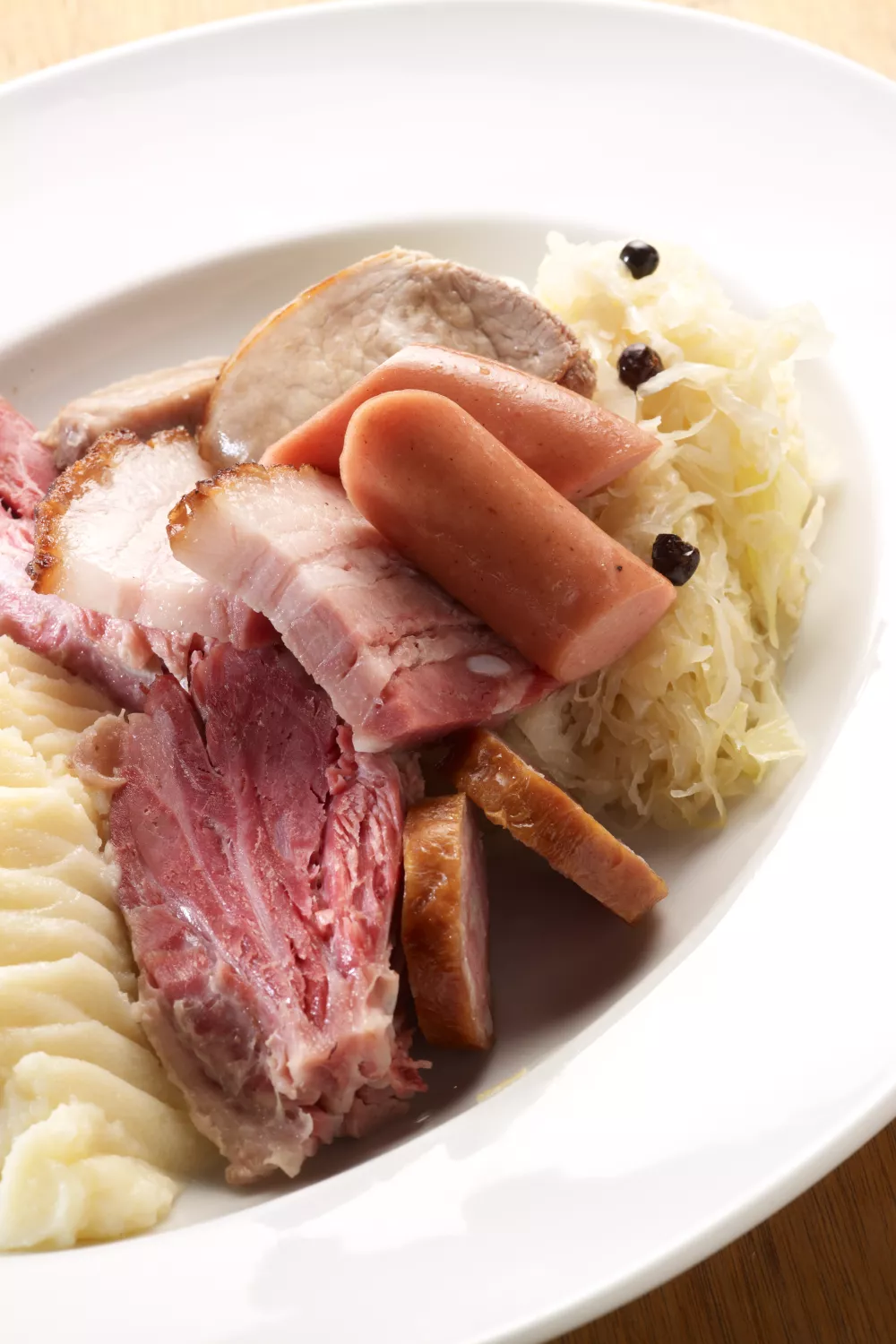 Schik de zuurkool op een bord en snijd het vlees. Verdeel over de borden samen met de gepocheerde worsten.