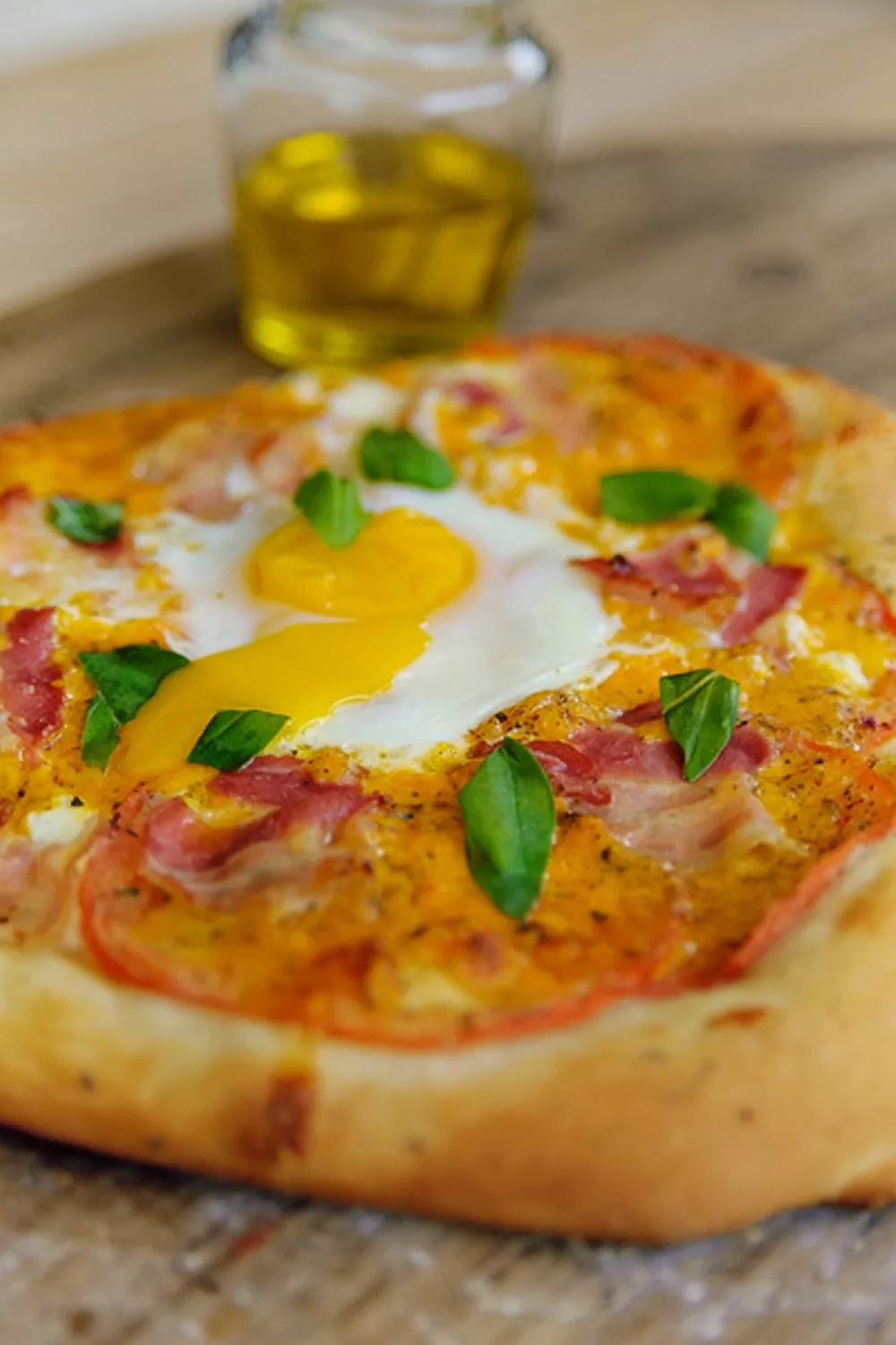 Hartige ontbijtpizza met een krokante pizzabodem, sappige tomaat, gesmolten cheddar en krokant spek is perfect voor een luie weekendbrunch. Door de pizza kort te bakken in de oven en het ei halverwege toe te voegen krijg je een romige, hartige kern. Werk af met verse basilicum voor een frisse, zomerse toets bij ontbijt, brunch of lichte lunch.
