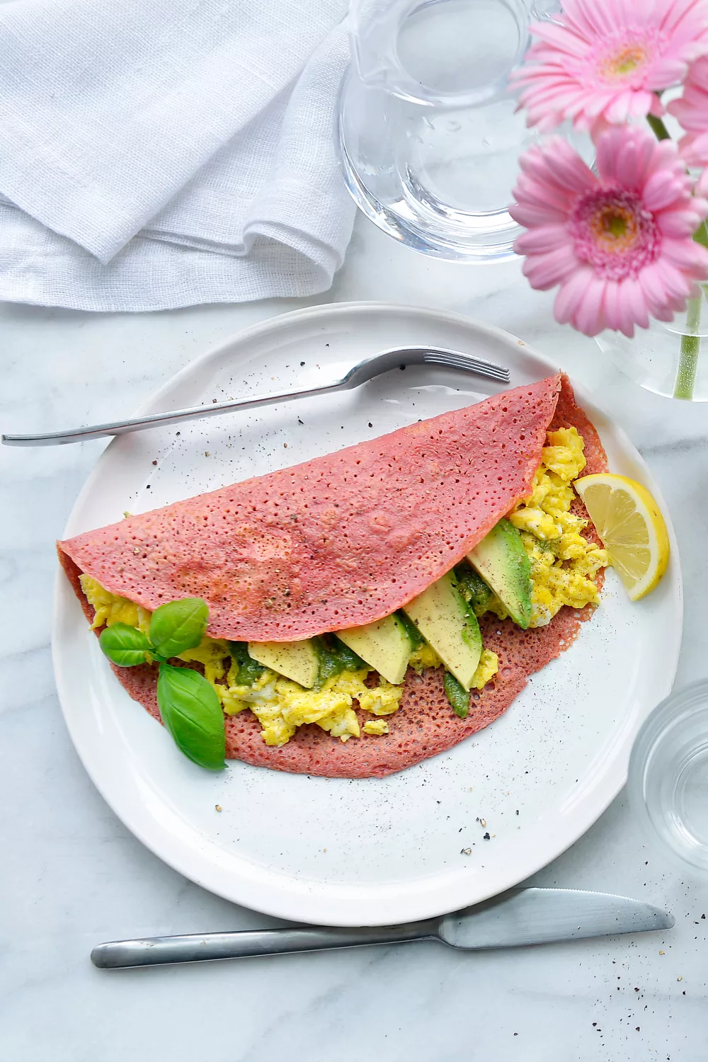 Verras je lunch met een hartige rodebietenwrap vol zacht roerei, huisgemaakte pesto en romige avocado. De roze wraps van bruine rijstmeel en geraspte rode biet worden kort in kokosolie gebakken, terwijl walnoot-basilicumpesto en limoensap frisse smaken toevoegen. Perfect als kleurrijke brunch of lichte zomermaaltijd.